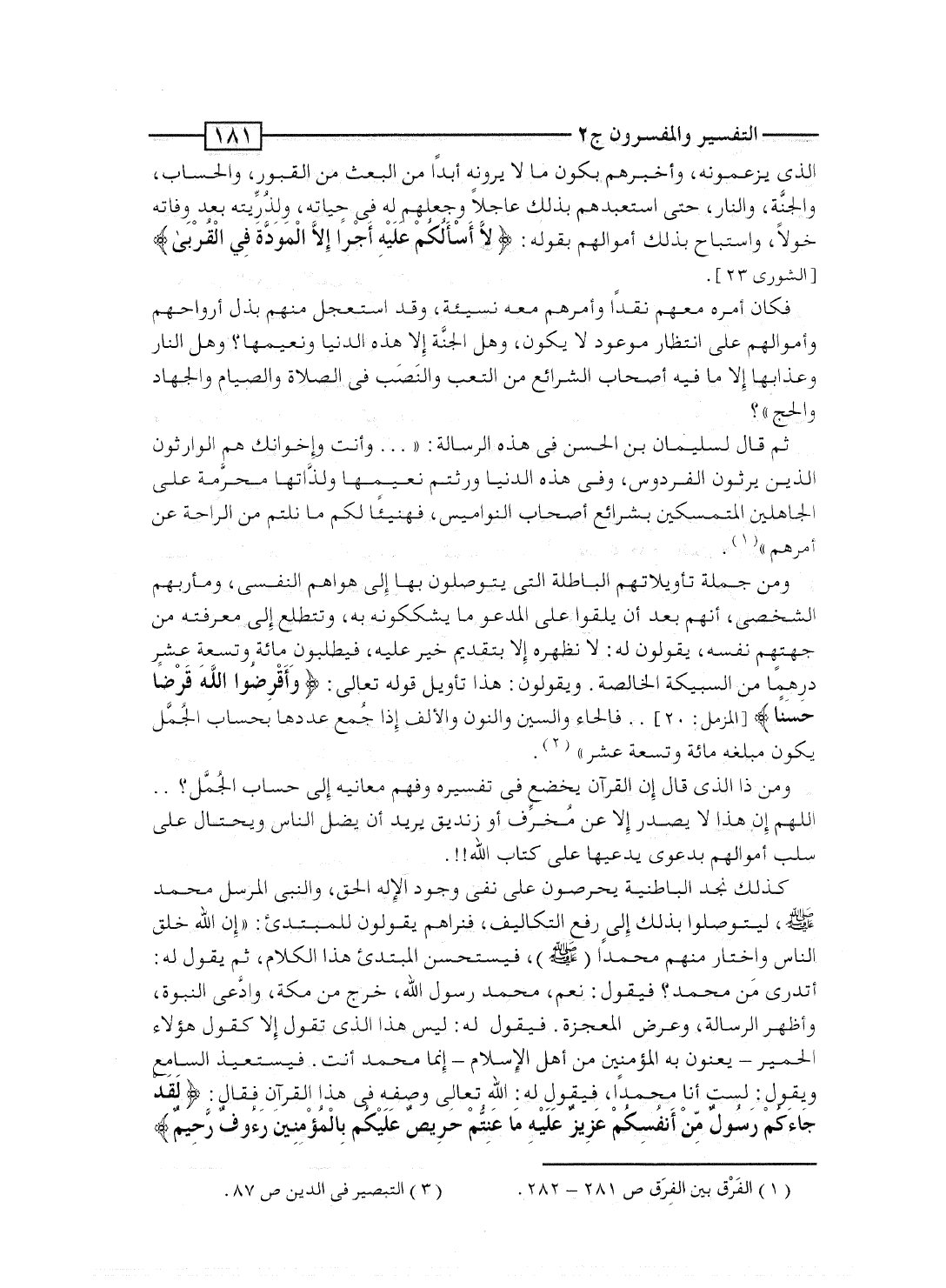 ومن جملة تأويلاتهم الباطلة التى يتوصلون بها إلى هواهم النفسى، ومأربهم الشخصى، أنهم بعد أن يلقوا على المدعو ما يشككونه به، وتتطلع إلى معرفته من جهتهم نفسه، ويقولون له: لا نظهره إلا بتقديم خير عليه، فيطلبون مائة وتسعة عشر درهماً من السبيكة الخالصة. ويقولون: هذا تأويل قوله تعالى: {وَأَقْرِضُواُ الله قَرْضاً حَسَناً} [المزمل: 20] .. فالحاء والسين والنون والألف إذا جُمِع عددها بحساب الجُمَّل يكون مبالغه مائة وتسعة عشر".