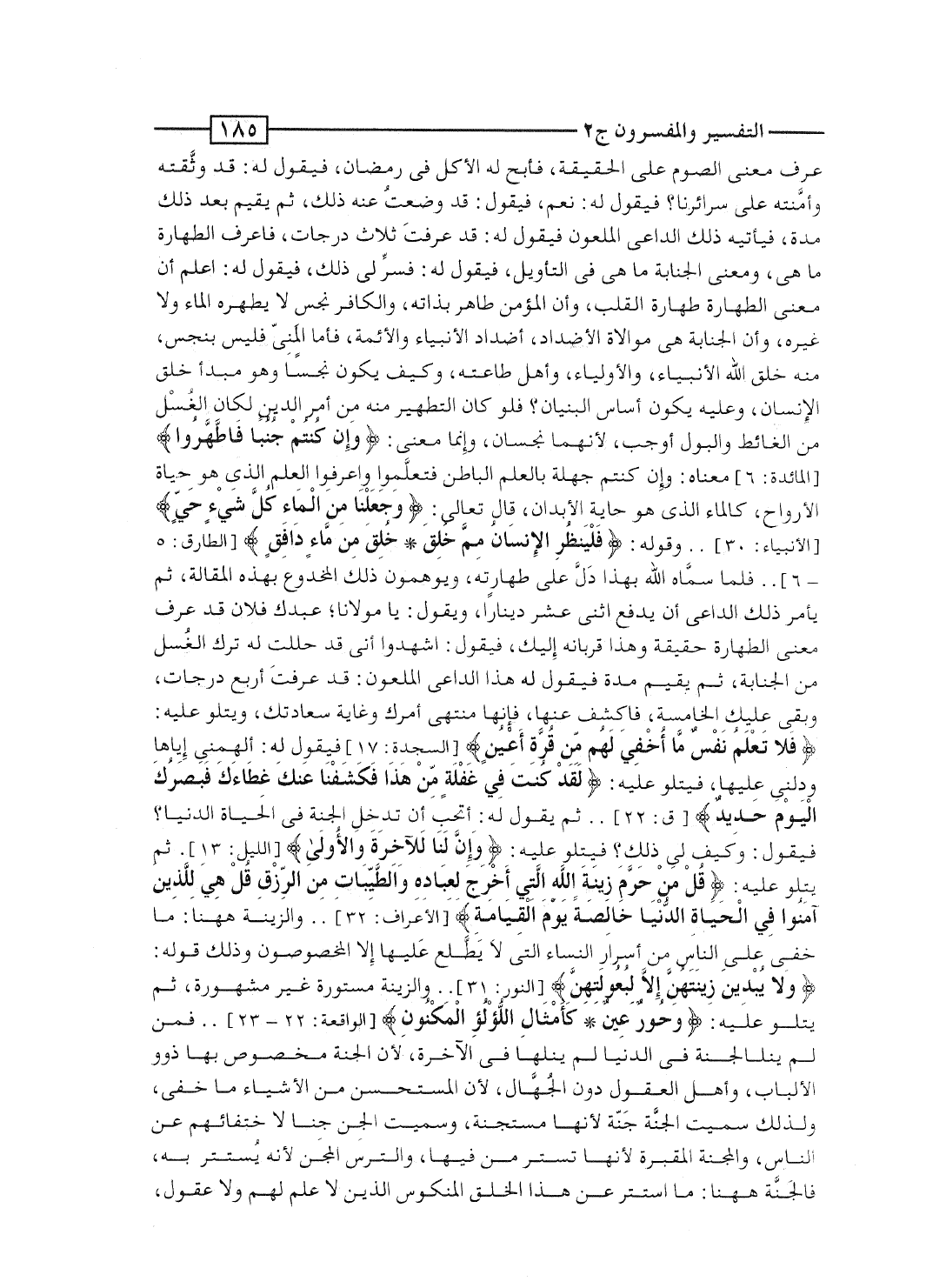 عليه: {لَّقَدْ كُنتَ فِي غَفْلَةٍ مِّنْ هاذا فَكَشَفْنَا عَنكَ غِطَآءَكَ فَبَصَرُكَ اليوم حَدِيدٌ} [ق: 22] .. ثم يقول له: أتحب أن تدخل الجنة فى الحياة الدنيا؟ فيقول: وكيف لى ذلك؟ فيتلو عليه: {وَإِنَّ لَنَا لَلآخِرَةَ والأولى} [الليل: 13] . ثم يتلو عليه: {قُلْ مَنْ حَرَّمَ زِينَةَ الله التي أَخْرَجَ لِعِبَادِهِ وَالْطَّيِّبَاتِ مِنَ الرزق قُلْ هِي لِلَّذِينَ آمَنُواْ فِي الحياة الدنيا خَالِصَةً يَوْمَ القيامة} [الأعراف: 32] .. والزينة ههنا: ما خفى على الناس من أسرار النساء التى لا يَطَّلع عَلِيها إلا المخلصوصون بذلك، وذلك قوله: {وَلاَ يُبْدِينَ زِينَتَهُنَّ إِلاَّ لِبُعُولَتِهِنَّ} [النور: 31] .. والزينة مستورة غير مشهورة، ثم يتلو عليه: {وَحُورٌ عِينٌ * كَأَمْثَالِ اللؤلؤ المكنون} [الواقعة: 22-23] .. فمن لم ينل الجنة فى الدنيا لم ينلَها فى الآخرة، لأن الجنة مخصوص بها ذوو الألباب، وأهل العقول دون الجُهَّال، لأن المستحسن من الأشياء ما خفى، ولذلك سميت الجنَّة جَنّة لأنها مستجنة، وسميت الجِن جِنا لاختفائهم عن الناس، والمجنة المقبرة لأنها تستر مَن فيها، والترس المجن لأنه يُستتر به، فالجَنَّة ههنا: ما استتر عن هذا الحق المنكوس الذين لا علم لهم ولا عقول،
