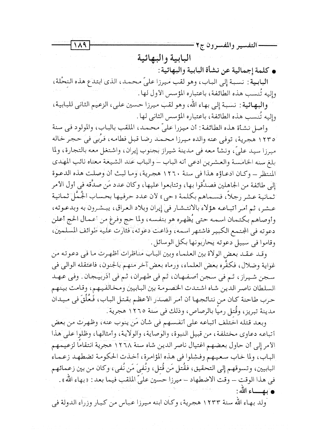 وأصل نشأة هذه الطائفة: أن ميرزا علىّ محمد، الملقب بالباب، والمولود فى سنة 1235 هجرية، توفى عنه والده ميرزا محمد رضا قبل فطامه، فرُبى في حجر خاله ميرزا سيد علىّ، ونشأ معه فى مدينة شيراز بجنوب إيران، واشتغل معه بالتجارة، ولما بلغ سنه الخامسة والعشرين ادعى أنه الباب - والباب عند الشيعة معناه نائب المهدى المنتظر - وكان ادعاؤه هذا فى سنة 1260 هجرية، وما لبث أن وصلت هذه الدعوة إلى طائفة من الجاهلين فصدَّقوا بها، وتتابعوا عليها، وكان عدد مَن صدَّقه في أول الأمر ثمانية عشر رجلاً، فسماهم بكلمة "حى" لأن عدد حرفيها بحساب الجُمَّل ثمانية عشر، ثم أمر أتباعه هؤلاء بالانتشار في إيران وبلاد العراق، يبشرون به وبدعوته، وأوصاهم بكتمان اسمه حتى يُظهره هو بنفسه، ولما حج وفرغ من أعمال الحج أعلن دعوته فى المجتمع الكبير فاشتهر اسمه، ولما حج وفرغ من أعمال الحج أعلن دعوته في المجتمع الكبير فاشتهر اسمه، وذاعت دعوته، فثارت عليه طوائف المسلمين، وقاموا فى سبيل دعوته يحاربونها بكل الوسائل.