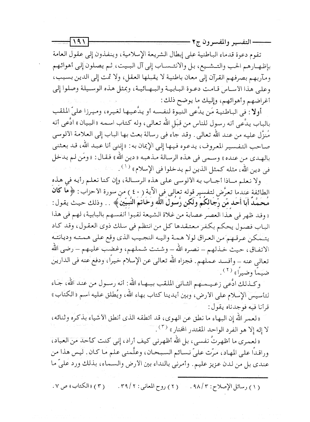 أولا: فى الباطنية مَن يدَّعى النبوة لنفسه أو يدَّعيها لغيره، وميرزا علىّ الملقب بالباب يدَّعى أنه رسول للناس من قِبَلِ الله تعالى، وله كتاب اسمه "البيان" ادَّعى أنه مُنزَّل عليه من عند الله تعالى. وقد جاء فى رسالة بعث بها الباب إلى العلامة الألوسى صاحب التفسير المعروف، يدعوه فيها إلى الإيمان به: "إنني أنا عبد الله، قد بعثنى بالهدى من عنده" وسمى فى هذه الرسالة مذهبه "دين الله" فقال: "ومَن لم يدخل فى دين الله، مثله كمثل الذين لم يدخلوا فى الإسلام".