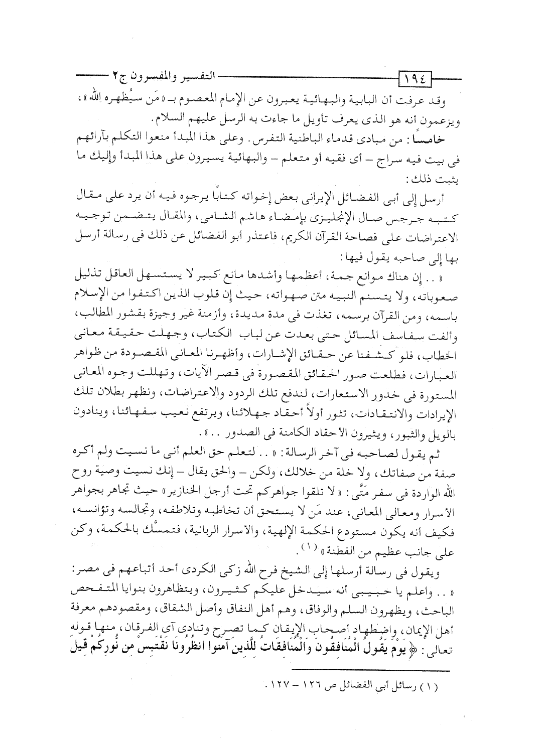 أرسل إلى أبى الفضائل الإيرانى بعض إخوانه كتاباً يرجوه فيه أن يرد على مقال كتبه جرجس صال الإنجليزى بإمضاء هاشم الشامى، والمقال يتضمن توجيه الاعتراضات على فصاحة القرآن الكريم، فاعتذر أبو الفضائل عن ذلك فى رسالة أرسل بها إلى صاحبه يقول فيها: