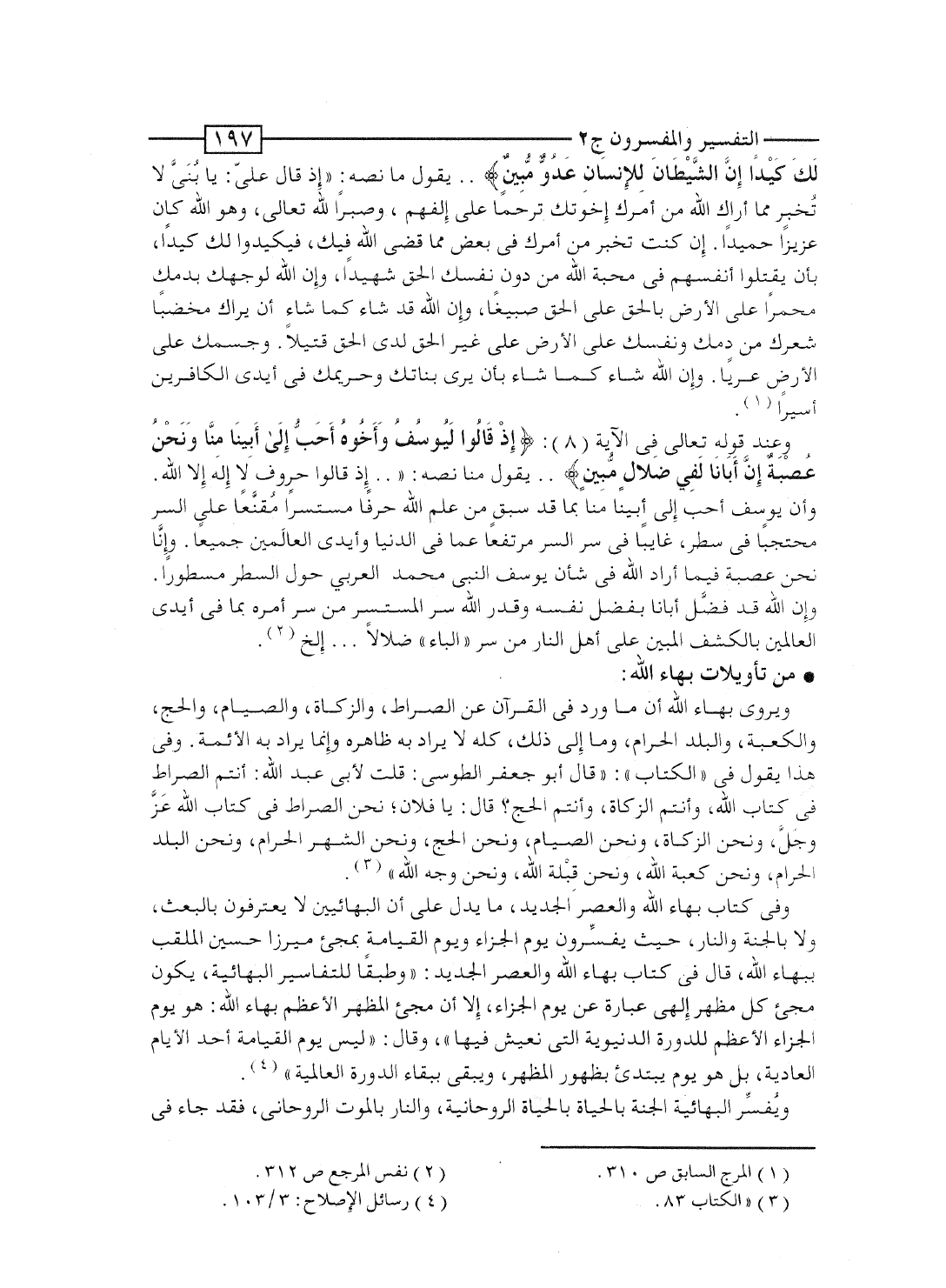 ويروى بهاء الله أن ما ورد فى القرآن عن الصراط، والزكاة، والصيام، والحج، والكعبة، والبلد الحرام، وما إلى ذلك، كله لا يراد به ظاهره وإنما يراد به الأئمة. وفى هذا يقول فى "الكتاب": "قال أبو جعفر الطوسى: قلت لأبى عبد الله: أنتم الصراط فى كتاب الله، وأنتم الزكاة، وأنتم الحج؟ قال: يا فلان؛ نحن الصراط فى كتاب الله عَزَّ وجَلَّ، ونحن الزكاة، ونحن الصيام، ونحن الحج، ونحن الشهر الحرام، ونحن البلد الحرام، ونحن كعبة الله، ونحن قِبْلة الله، ونحن وجه الله".