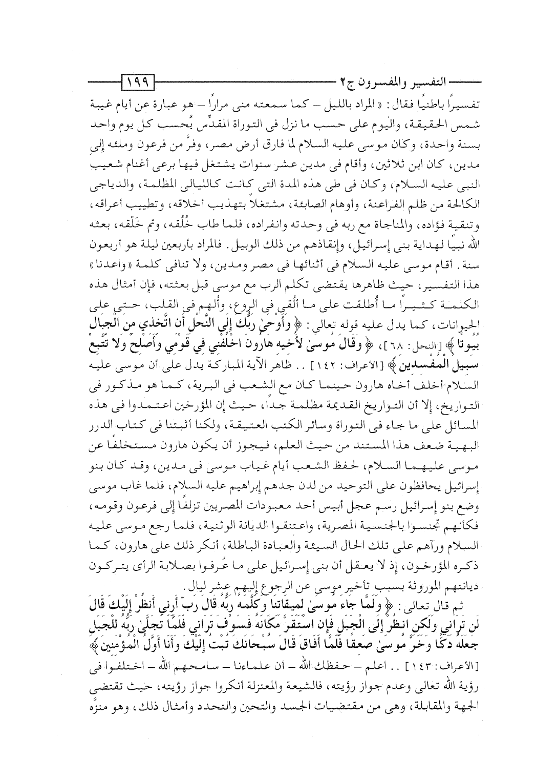 تفسيراً باطنياً فقال: "المراد بالليل - كما سمعته منى مراراً - هو عبارة عن أيام غيبة شمس الحقيقة، واليوم حسب ما نزل فى التوراة المقدِّس يُحسب كل يوم واحد بسنة واحدة، وكان موسى عليه السلام لما فارق أرض مصر، وفرَّ من فرعون وملئه إلى مدين، كان ابن ثلاثين، وأقام فى مدين عشر سنوات يشتغل فيها برعى أغنام شعيب النبى عليه السلام، وكان فى طى هذه المدة التى كانت كالليالى المظلمة، والدياجى الكالحة من ظلم الفراعنة، وأوهام الصابئة، مشتغلاً بتهذيب أخلاقه، وتطييب أعراقه، وتنقية فؤاده، والمناجاة مع ربه فى وحدته وانفراده، فلما طاب خلُقُه، وتم خَلْقه، بعثه الله نبياً لهداية بنى إسرائيل، وإنقاذهم من ذلك الوبيل. فالمراد بأربعين ليلة هو أربعون سنة. أقام موسى عليه السلام فى أثنائها فى مصر ومدين، ولا تنافى كلمة "واعدنا" هذا التفسير، حيث ظاهرها يقتضى تكلم الرب مع موسى قبل بعثته، فإن أمثال هذه الكلمة كثيراً ما أُطلقت على ما أُلقى فى الروع، وأُلهم فى القلب، حتى على الحيوانات، كما يدل عليه قوله تعالى: {وأوحى رَبُّكَ إلى النحل أَنِ اتخذي مِنَ الجبال بُيُوتاً} ، {وَقَالَ موسى لأَخِيهِ هَارُونَ اخلفني فِي قَوْمِي وَأَصْلِحْ وَلاَ تَتَّبِعْ سَبِيلَ المفسدين} ... ظاهر الآية المباركة يدل على أن موسى عليه السلام أخلف أخاه هارون حينما كان مع الشعب فى البرية، كما هو مذكور فى التواريخ، إلا أن التواريخ القديمة مظلمة جداً، حيث إن المؤرخين اعتمدوا فى هذه المسائل على ما جاء فى التوراة وسائر الكتب العتيقة، ولكنا أثبتنا فى كتاب الدرر البهية ضعف هذا المستند من حيث العلم، فيجوز أن يكون هارون مستخلفاً عن موسى عليهما السلام، لحفظ الشعب أيام غياب موسى فى مدين، وقد كان بنو إسرائيل يحافظون على التوحيد من لدن جدهم إبراهيم عليه السلام، فلما غاب موسى وضع بنو إسرائيل رسم عجل إبيس أحد معبودات المصريين تزلفاً إلى فرعون وقومه،