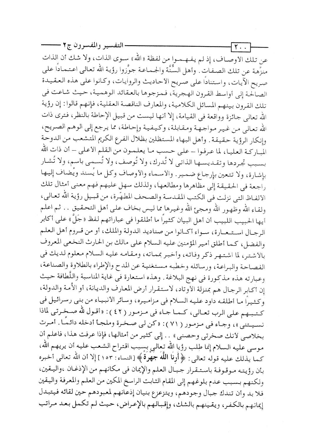 عن تلك الأوصاف، إذ لم يفهموا من لفظة "الله" سوى الذات، ولا شك أن الذات منزَّهة عن تلك الصفات. وأهل السُّنَّة والجماعة جوَّزوا رؤية الله تعالى اعتماداً على صريح الآيات، واستناداً على صريح الأحاديث والروايات، وكانوا على هذه العقيدة الصالحة إلى أواسط القرون الهجرية، فمزجوها بالعقائد الوهمية، حيث شاعت فى تلك القرون بينهم المسائل الكلامية، والمعارف الناقصة العقلية، فإنهم قالوا: إن رؤية الله تعالى جائزة وواقعة فى القيامة، إلا أنها ليست من قبيل الإحاطة بالنظر، فترى ذات الله تعالى من غير مواجهة ومقابلة، وكيفية وإحاطة، مما يرجع إلى الوهم الصريح، وإنكار الرؤية حقيقة، وأهل البهاء المستظلين بظلال الفرع الكريم المتشعب من الدوحة المباركة العليا، لما عرفوا - على حسب ما يعلمون من القلم الأعلى - أن ذات الله بسبب تجردها وتقديسها الذاتى لا تُدرك، ولا تُوصف، ولا تُسمى باسم، ولا تُشار بإشارة، ولا تتعين بإرجاع ضمير. والأسماء والأوصاف وكل ما يُسند ويُضاف إليها راجعة فى الحقيقة إلى مظاهرها ومطالعها، ولذلك سهل عليهم فهم معنى أمثال تلك الألفاظ التى نزلت فى الكتب المقدسة والصحف المطهّرة، من قبيل رؤية الله تعالى، ولقاء الله وظهور الله ومجىء الله وغيرها مما ليس بخاف على أهل التحقيق. ثم اعلم أيها الحبيب اللبيب أن أهل البيان كثيراً ما أطلقوا فى عباراتهم لفظ "جَلَّ" على أكابر الرجال استعارة، سواء أكانوا من صناديد الدولة والملك، أو من