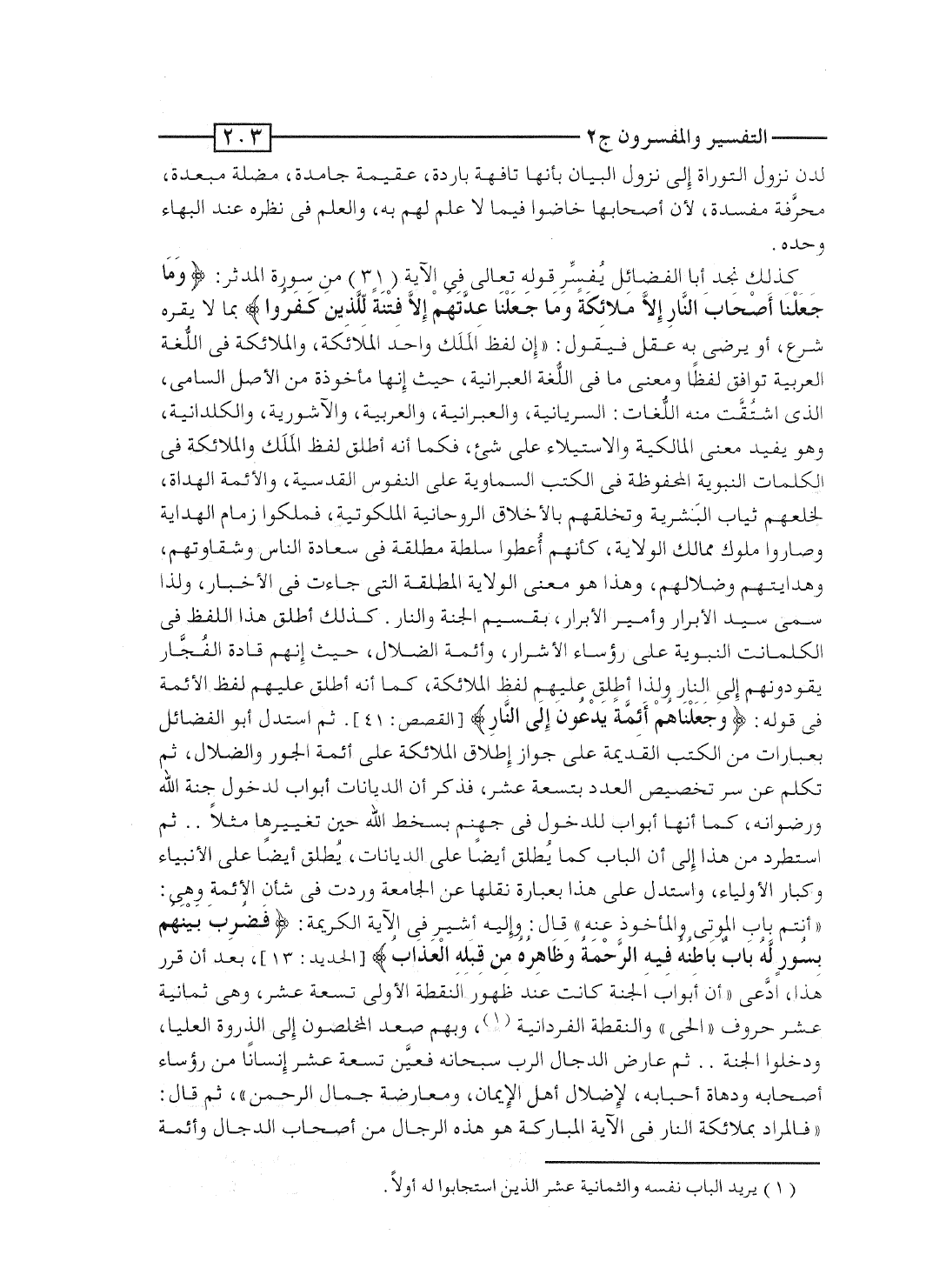 كذلك نجد أبا الفضائل يُفسِّر قوله تعالى فى الآية [31] من سورة المدثر: {وَمَا جَعَلْنَآ أَصْحَابَ النار إِلاَّ مَلاَئِكَةً وَمَا جَعَلْنَا عِدَّتَهُمْ إِلاَّ فِتْنَةً لِّلَّذِينَ كَفَرُواْ} بما لا يقره شرع، أو يرضى به عقل فيقول: "إن لفظ المَلَك واحد الملائكة، والملائكة في اللُّغة العربية توافق لفظاَ ومعنى ما في اللُّغة العبرانية، حيث إنها مأخوذة من الأصل السامى، الذى اشتُقَّت منه اللُّغات: السريانية، والعبرانية، والعربية، والآشورية، والكلدانية، وهو يفيد معنى المالكية والاستيلاء على شىء، فكما أنه أطلق لفظ المَلَك والملائكة في الكلمات النبوية المحفوظة في الكتب السماوية على النفوس القدسية، والأئمة الهداة، لخلعهم ثياب البشرية وتخلقهم بالأخلاق الروحانية الملكوتية، فملكوا زمام الهداية وصاروا ملوك ممالك الولاية، كأنهم أُعطوا سلطة مطلقة فى سعادة الناس وشقاوتهم، وهدايتهم وضلالهم، وهذا هو معنى الولاية المطلقة التى جاءت فى الأخبار، ولذا سمى سيد الأبرار وأمير الأبرار، بقسيم الجنة والنار. كذلك أطلق هذا اللفظ فى الكلمات النبوية على رؤساء الأشرار، وأئمة الضلال، حيث إنهم قادة الفُجَّار يقودونهم إلى النار ولذا أطلق عليهم لفظ الملائكة، كما أنه أطلق عليهم لفظ الأئمة فى قوله: {وَجَعَلْنَاهُمْ أَئِمَّةً يَدْعُونَ إِلَى النار} [القصص: 41] . ثم استدل أبو الفضائل بعبارات من الكتب القديمة على جواز إطلاق الملائكة على أئمة الجور والضلال، ثم تكلم عن سر تخصيص العدد بتسعة عشر، فذكر أن الديانات أبواب لدخول جنة الله ورضوانه، كما أنها أبواب للدخول فى جهنم بسخط الله حين تغييرها مثلاً ... ثم استطرد من هذا إلى أن الباب كما يُطلق أيضاً على الديانات، يُطلق أيضاً على الأنبياء وكبار الأولياء، واستدل على هذا بعبارة نقلها عن الجامعة وردت فى شأن الأئمة وهى: "أنتم باب الموتى والمأخوذ عنه" قال: وإليه أشير فى الآية الكريمة: {فَضُرِبَ بَيْنَهُم بِسُورٍ لَّهُ بَابٌ بَاطِنُهُ فِيهِ الرحمة وَظَاهِرُهُ مِن قِبَلِهِ العذاب} [الحديد: 13] ، بعد أن قرر هذا، ادَّعى "أن أبواب الجنة كانت عند ظهور النقطة الأولى تسعة عشر، وهى