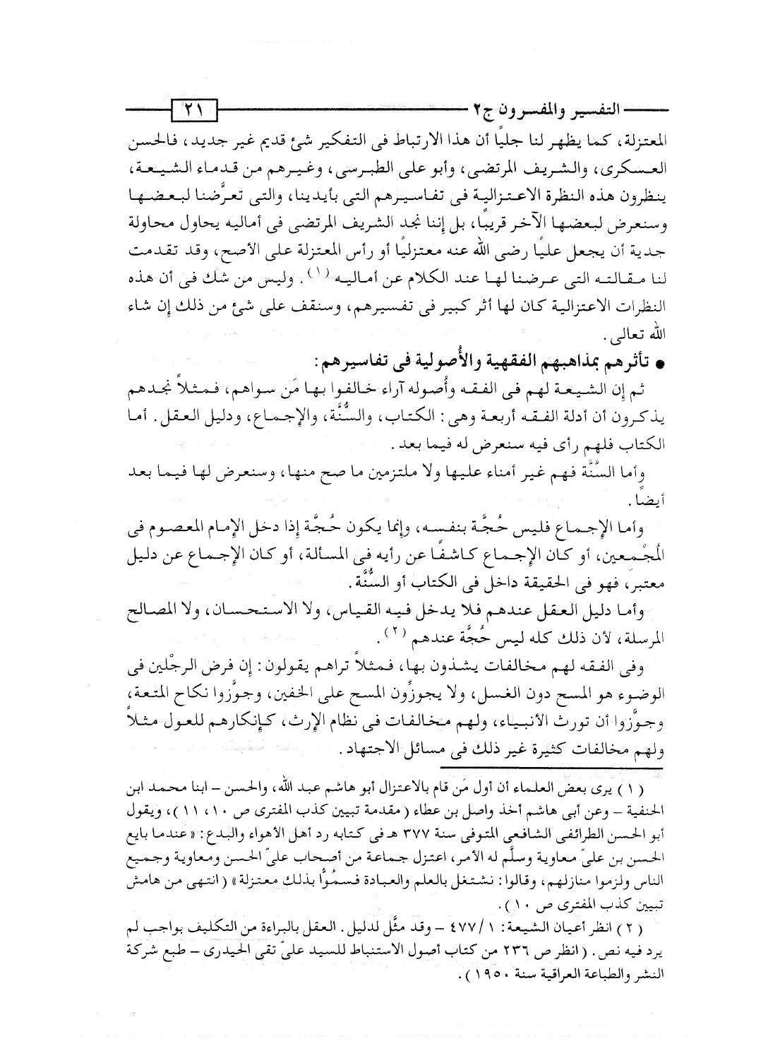 المعتزلة، كما يظهر لنا جلياً أن هذا الارتباط فى التفكير شئ قديم غير جديد، فالحسن العسكرى، والشريف المرتضى، وأبو على الطبرسى، وغيرهم من قدماء الشيعة، ينظرون هذه النظرة الاعتزالية فى تفاسيرهم التى بأيدينا، والتى تعرَّضنا لبعضها وسنعرض لبعضها الآخر قريباً، بل إننا نجد الشريف المرتضى فى أماليه يحاول محاولة جدية أن يجعل علياً رضى الله عنه معتزلياً أو رأس المعتزلة على الأصح، وقد تقدمت لنا مقالته التى عرضنا لها عند الكلام عن أماليه. وليس من شك فى أن هذه النظرات الاعتزالية كان لها أثر كبير فى تفسيرهم، وسنقف على شئ من ذلك إن شاء الله تعالى.