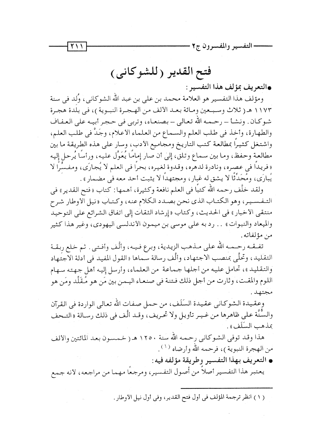 ومؤلف هذا التفسير هو العلامة محمد بن علي بن عبد الله الشوكانى، وُلِد فى سنة 1173هـ (ثلاث وسبعين ومائة بعد الألف من الهجرة النبوية) ، فى بلدة هجرة شوكان. ونشأ - رحمه الله تعالى - بصنعاء، وتربى فى حجر أبيه على العفاف والطهارة، وأخذ فى طلب العلم والسماع من العلماء الأعلام، وجَدَّ فى طلب العلم، واشتغل كثيراً بمطالعة كتب التاريخ ومجاميع الأدب، وسار على هذه الطريقة ما بين مطالعة وحفظ، وما بين سماع وتلق، إلى أن صار إماماً يُعَوَّل عليه، ورأساً يُرحل إليه "فريداً فى عصره، ونادرة لدهره، وقدوة لغيره، بحراً فى العلم لا يُجارَى، ومفسِّراً للقرآن لا يُبارَى، ومُحَدِّثاً لا يشق له غبار، ومجتهداً لا يثبت أحد معه فى مضمار".