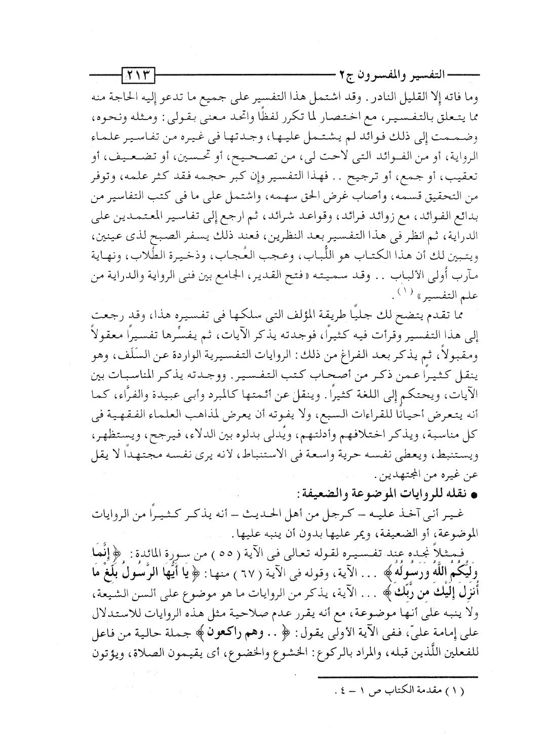 فمثلاً نجده عند تفسيره لقوله تعالى فى الآية [55] من سورة المائدة: {إِنَّمَا وَلِيُّكُمُ الله وَرَسُولُهُ} ... الآية، وقوله فى الآية [67] منها: {ياأيها الرسول بَلِّغْ مَآ أُنزِلَ إِلَيْكَ مِن رَّبِّكَ} ... الآية، يذكر من الروايات ما هو موضوع على ألسن الشيعة، ولا ينبه على أنها موضوعة، مع أنه يقرر عدم صلاحية مثل هذه الروايات للاستدلال على إمامة علىّ، ففى الآية الأولى يقول: {.. وَهُمْ رَاكِعُونَ} جملة حالية من فاعل للفعلين اللَّذين قبله، والمراد بالركوع: الخشوع والخضوع، أى يقيمون الصلاة، ويؤتون