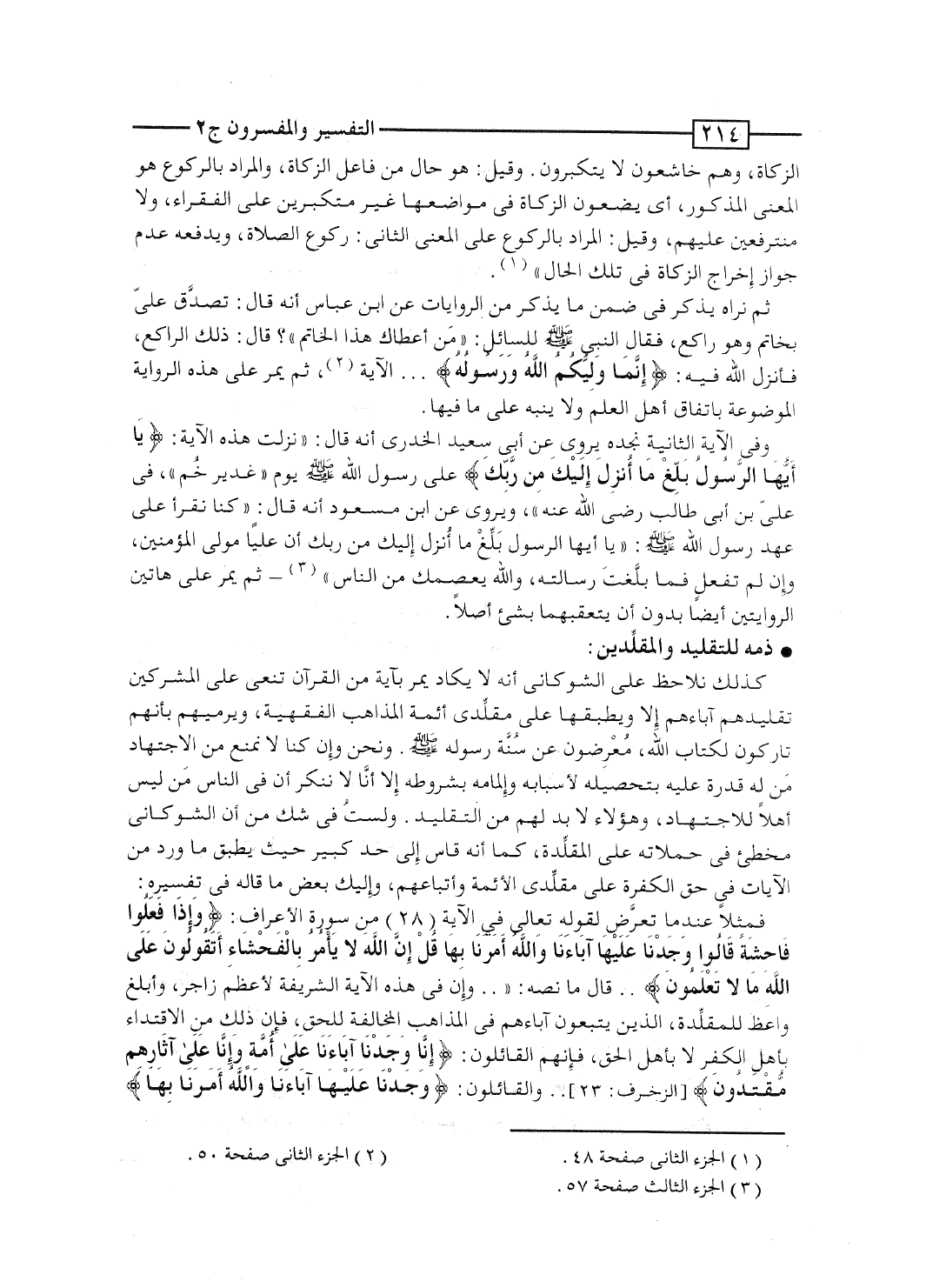 وفى الآية الثانية نجده يروى عن أبى سعيد الخدرى أنه قال: "نزلت هذه الآية: {ياأيها الرسول بَلِّغْ مَآ أُنزِلَ إِلَيْكَ مِن رَّبِّكَ} على رسول الله صلى الله عليه وسلم يوم "غدير خُم"، فى علىّ بن أبي طالب رضى الله عنه"، ويروى عن ابن مسعود أنه قال: "كنا نقرأ على عهد رسول الله صلى الله عليه وسلم: "يا أيها الرسول بَلِّغْ ما أُنزل إليك من ربك أن علياً مولى المؤمنين، وإن لم تفعل فما بلَّغتَ رسالته، والله يعصمك من الناس" - ثم يمر على هاتين الروايتين أيضاً بدون أن يتعقبهما بشىءٍ أصلاً.