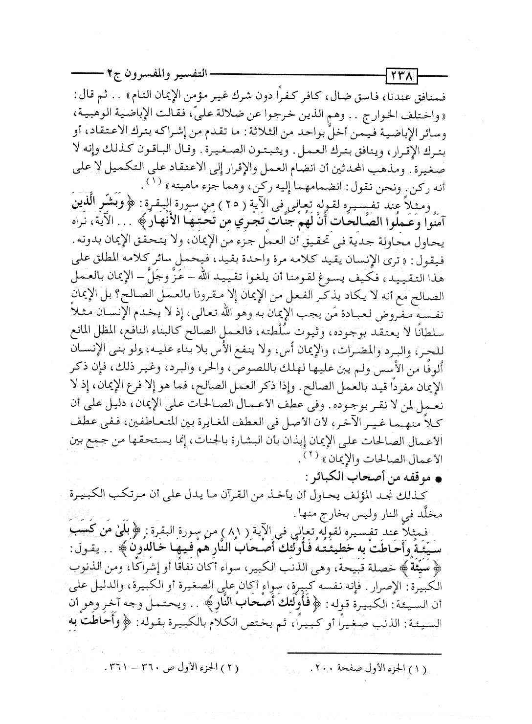 فمثلاً عند تفسيره لقوله تعالى فى الآية [81] من سورة البقرة: {بلى مَن كَسَبَ سَيِّئَةً وَأَحَاطَتْ بِهِ خطيائته فأولائك أَصْحَابُ النار هُمْ فِيهَا خَالِدُونَ} .. يقول: {سَيِّئَةً} خصلة قبيحة، وهى الذنب الكبير، سواء أكان نفاقاً أو إشراكاً، ومن الذنوب الكبيرة: الإصرار، فإنه نفسه كبيرة، سواء أكان على الصغيرة أو الكبيرة، والدليل على أن السيئة: الكبيرة قوله: {فأولائك أَصْحَابُ النار} .. ويحتمل وجه آخر وهو أن السيئة: الذنب صغيراً أو كبيراً، ثم يختَص الكلام بالكبيرة بقوله: {وَأَحَاطَتْ بِهِ