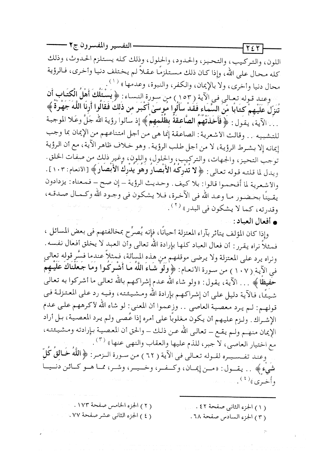 وعند قوله تعالى فى الآية [153] من سورة النساء: {يَسْأَلُكَ أَهْلُ الكتاب أَن تُنَزِّلَ عَلَيْهِمْ كِتَاباً مِّنَ السمآء فَقَدْ سَأَلُواْ موسى أَكْبَرَ مِن ذلك فقالوا أَرِنَا الله جَهْرَةً} ... الآية، يقول: {فَأَخَذَتْهُمُ الصَّاعِقَةُ بِظُلْمِهِم} إذ سألوا رؤية الله جَلَّ وعَلا الموجبة للتشبيه ... وقالت الأشعرية: الصاعقة إنما هى من أجل امتناعهم من الإيمان بما وجب إيمانه إلا بشرط الرؤية، لا من أجل طلب الرؤية. وهو خلاف ظاهر الآية، مع أن الرؤية توجب التحيز، والجهات، والتركيب، والحلول، واللون، وغير ذلك من صفات الخلق. ويدل لما قلته قوله تعالى: {لاَّ تُدْرِكُهُ الأبصار وَهُوَ يُدْرِكُ الأبصار} [الأنعام: 103] . والأشعرية لما أُفحموا قالوا: بلا كيف. وحديث الرؤية - إن صح - فمعناه: يزدادون يقيناً بحضور ما وعد الله فى الآخرة، فلا يشكون فى وجود الله وكمال صدقه، وقدرته، كما لا يشكون فى البدر".