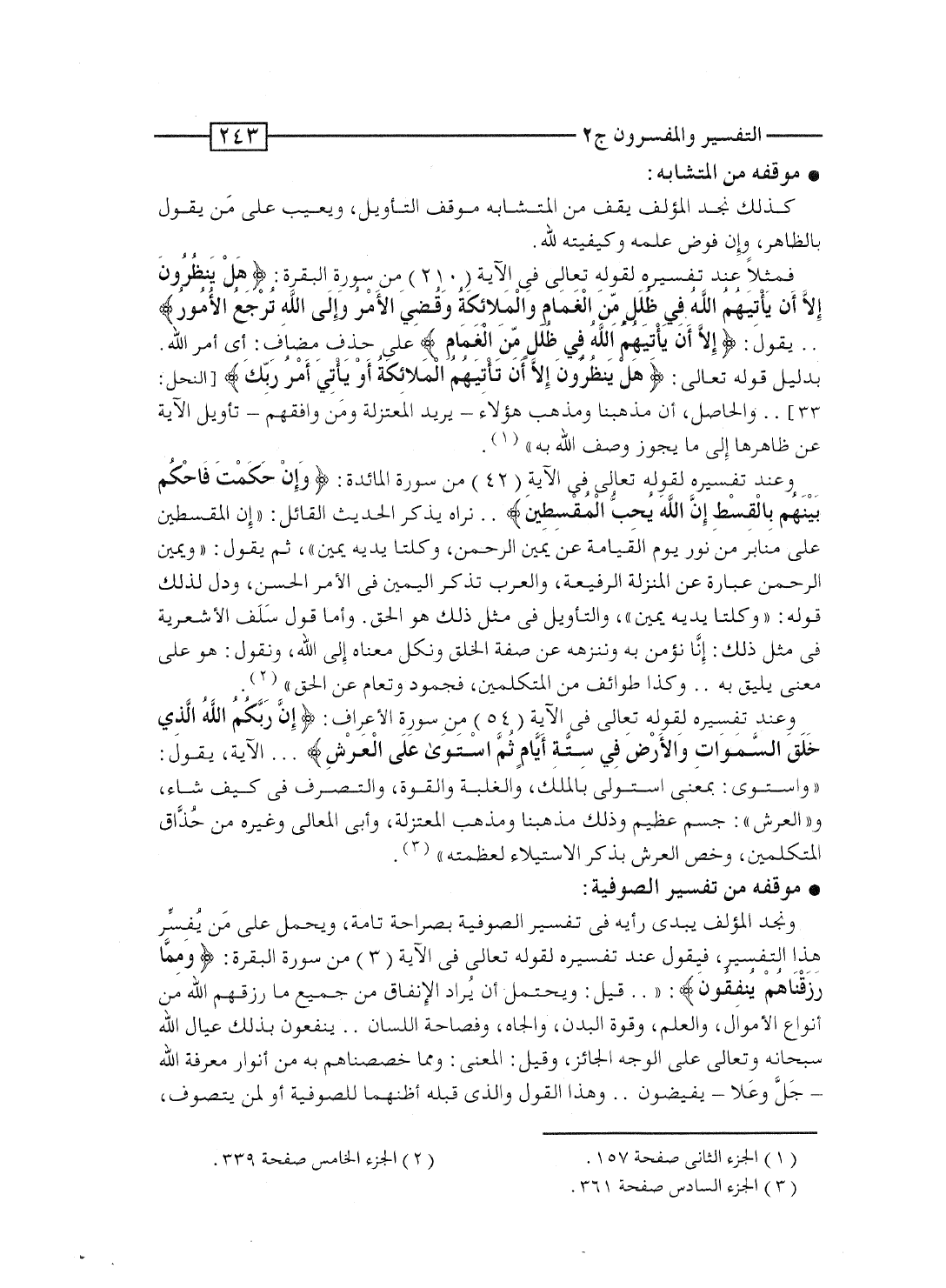 كذلك نجد المؤلف يقف من المتشابه موقف التأويل، ويعيب على مَن يقول بالظاهر، وإن فوَّض علمه وكيفيته لله.