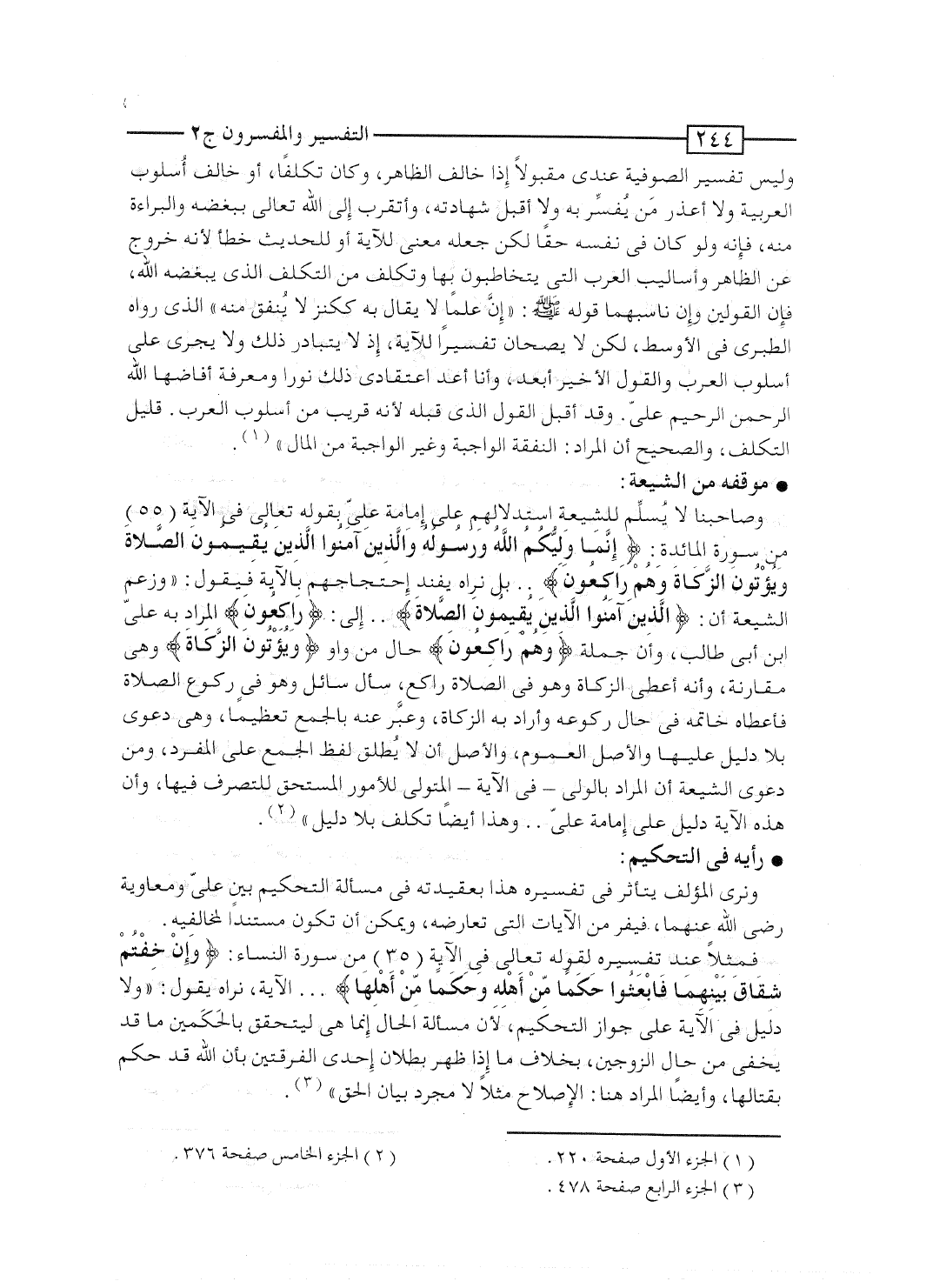وصاحبنا لا يُسلِّم للشيعة استدلالهم على إمامة علىّ بقوله تعالى فى الآية [55] من سورة المائدة: {إِنَّمَا وَلِيُّكُمُ الله وَرَسُولُهُ والذين آمَنُواْ الذين يُقِيمُونَ الصلاة وَيُؤْتُونَ الزكاة وَهُمْ رَاكِعُونَ} ... بل نراه يفند احتجاجهم بالآية فيقول: "وزعم الشيعة أن: {والذين آمَنُواْ الذين يُقِيمُونَ الصلاة} ... إلى: {رَاكِعُونَ} المراد به علىّ بن أبى طالب، وأن جملة {وَهُمْ رَاكِعُونَ} حال من واو {وَيُؤْتُونَ الزكاة} وهى مقارنة، وأنه أعطى الزكاة وهو فى الصلاة راكع، سأل سائل وهو فى ركوع الصلاة فأعطاه خاتمه فى حال ركوعه وأراد به الزكاة، وعبَّر عنه بالجمع تعظيماً، وهى دعوى بلا دليل عليها والأصل العموم، والأصل أن لا يُطلق لفظ الجمع على المفرد، ومن دعوى الشيعة أن المراد بالولى - فى الآية - المتولى للأمور المستحق للتصرف فيها، وأن هذه الآية دليل على إمامة علىّ ... وهذا أيضاً تكلف بلا دليل".