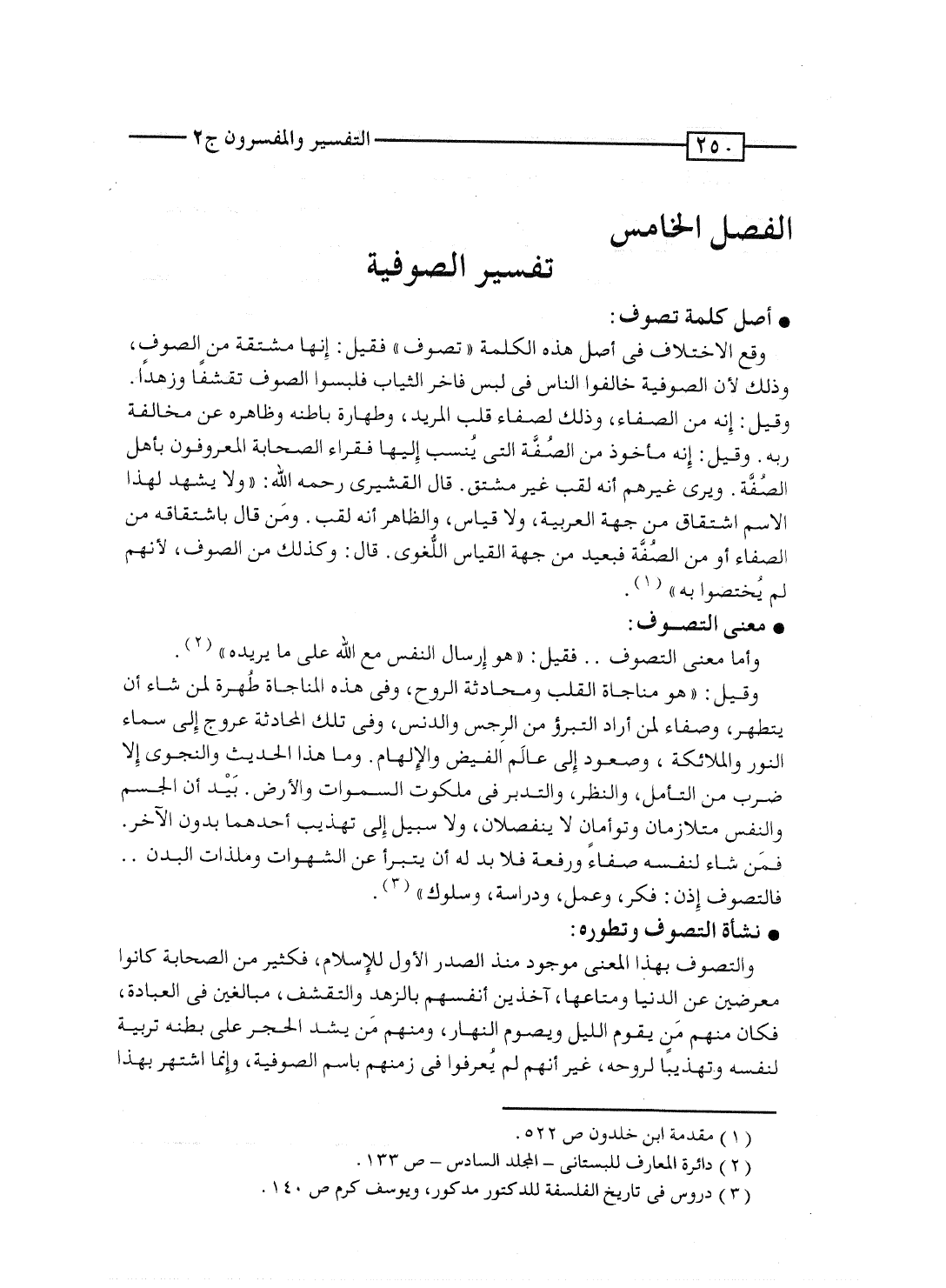 وقع الاختلاف فى أصل هذه الكلمة "تصوف" فقيل: إنها مشتقة من الصوف، وذلك لأن الصوفية خالفوا الناس فى لبس فاخر الثياب فلبسوا الصوف تقشفاً وزهداً. وقيل: إنه من الصفاء، وذلك لصفاء قلب المريد، وطهارة باطنه وظاهره عن مخالفه ربه. وقيل: إنه مأخوذ من الصُفَّة التى يُنسب إليها فقراء الصحابة المعروفون بأهل الصُفَّة. ويرى غيرهم أنه لقب غير مشتق. قال القشيرى رحمه الله: "ولا يشهد لهذا الاسم اشتقاق من جهة العربية، ولا قياس، والظاهر أنه لقب. ومَن قال باشتقاقه من الصفاء أو من الصُفَّة فبعيد من جهة القياس اللُّغوى. قال: وكذلك من الصوف، لأنهم لم يُختصوا به".