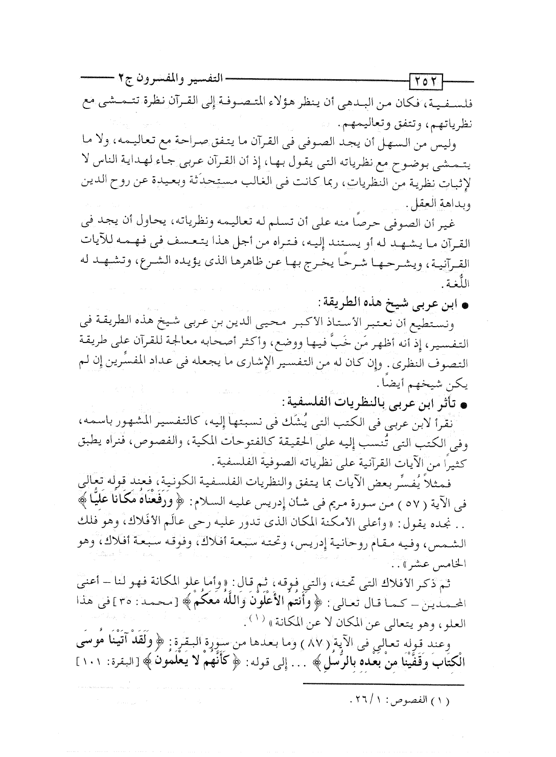نقرأ لابن عربى فى الكتب التى يُشَك فى نسبتها إليه، كالتفسير المشهور باسمه، وفى الكتب التى تُنسب إليه على الحقيقة كالفتوحات المكية، والفصوص، فنراه يطبق كثيراً من الآيات القرآنية على نظرياته الصوفية الفلسفية.