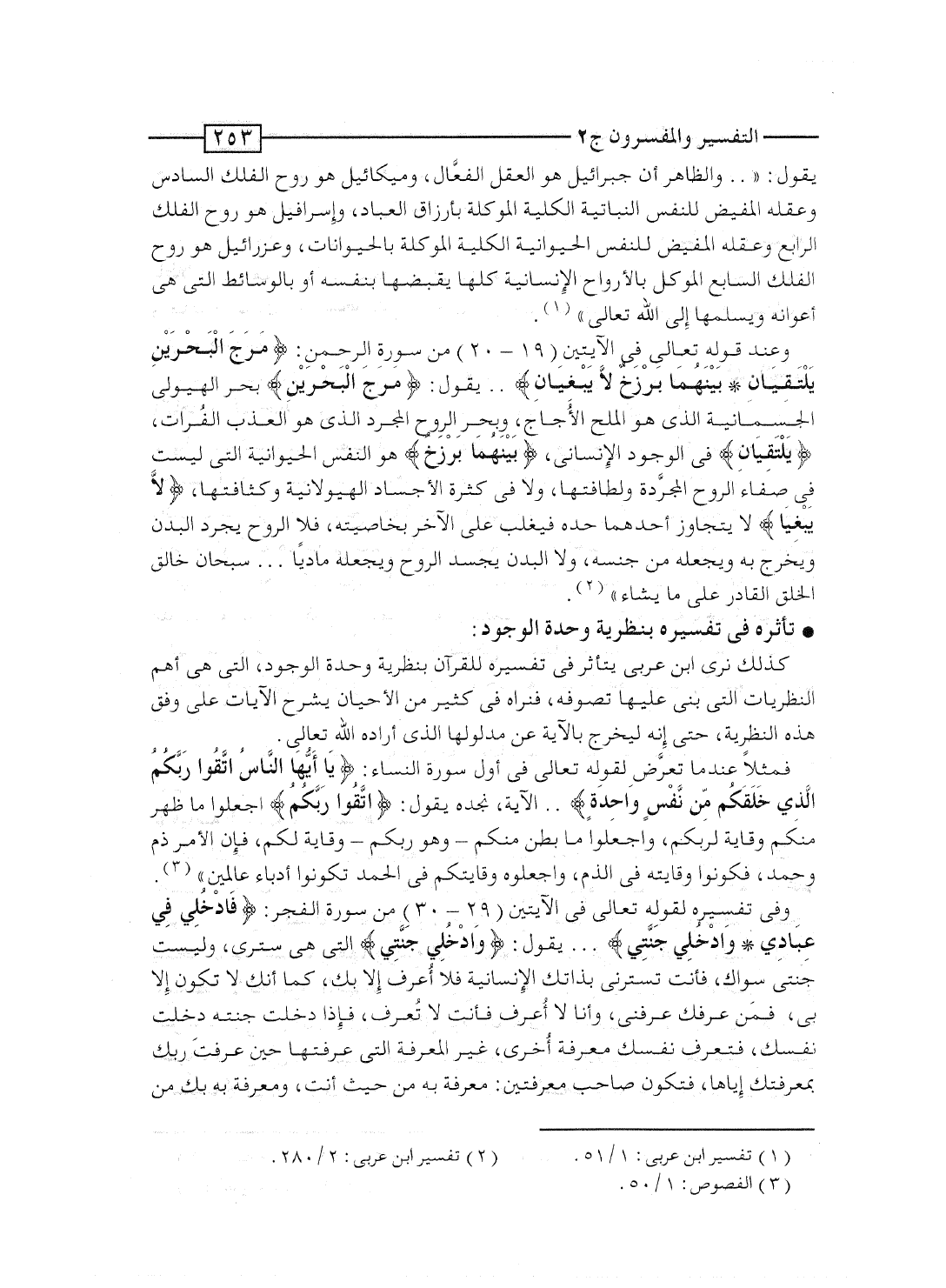 وعند قوله تعالى فى الآيتين [19-20] من سورة الرحمن: {مَرَجَ البحرين يَلْتَقِيَانِ * بَيْنَهُمَا بَرْزَخٌ لاَّ يَبْغِيَانِ} ... يقول: {مَرَجَ البحرين} بحر الهيولى الجسمانية الذى هو الملح الأُجاج، وبحر الروح المجرد الذى هو العذب الفُرات، {يَلْتَقِيَانِ} فى الوجود الإنسانى، {بَيْنَهُمَا بَرْزَخٌ} هو النفس الحيوانية التى ليست فى صفاء الروح المجرَّدة ولطافتها، ولا فى كثرة الأجساد الهيولانية وكثافتها، {لاَّ يَبْغِيَانِ} لا يتجاوز أحدهما حده فيغلب على الآخر بخاصيته، فلا الروح يجرد البدن ويخرج به ويجعله من جنسه، ولا البدن يجسد الروح ويجعله مادياً ... سبحان خالق الخلق القادر على ما يشاء".