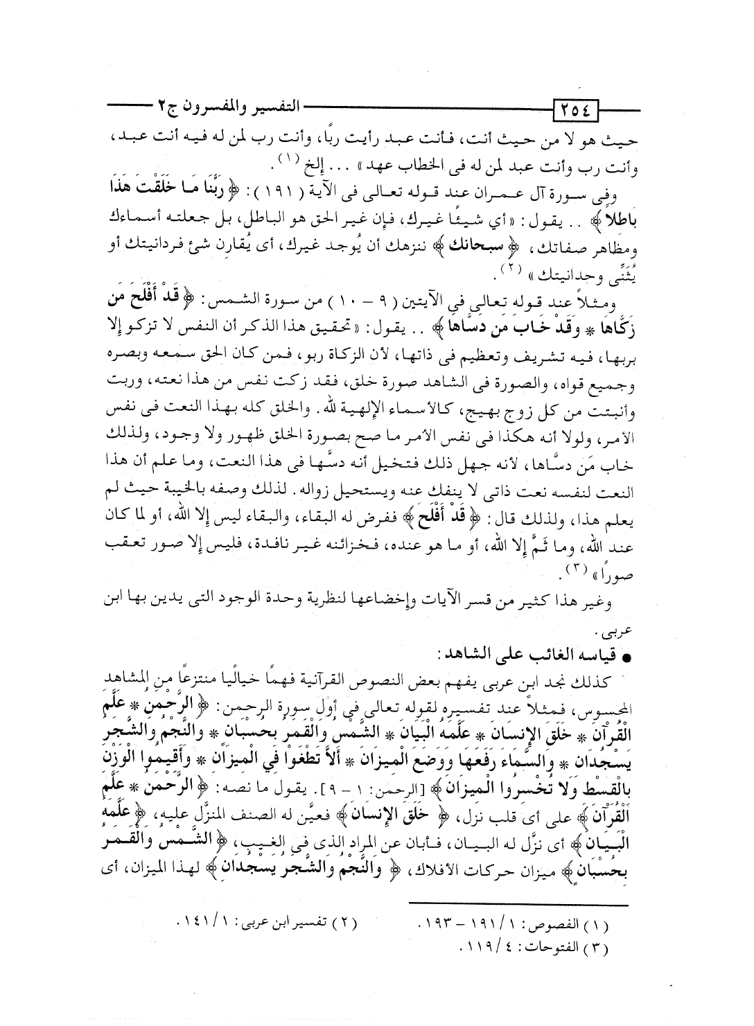 ومثلاً عند قوله تعالى فى الآيتين [9-10] من سورة الشمس: {قَدْ أَفْلَحَ مَن زَكَّاهَا * وَقَدْ خَابَ مَن دَسَّاهَا} ... يقول: "تحقيق هذا الذكر أن النفس لا تزكو إلا بربها، فيه تشريف وتعظيم فى ذاتها، لأن الزكاة ربو، فمن كان الحق سمعه وبصره وجميع قواه، والصورة فى الشاهد صورة خلق، فقد زكت نفس مَن هذا نعته، وربت وأنبتت من كل زوج بهيج، كالأسماء الإلهية لله. والخلق كله بهذا النعت فى نفس الأمر، ولولا أنه هكذا فى نفس الأمر ما صح بصورة الخلق ظهور ولا وجود، ولذلك خاب مَن دسَّاها، لأنه جهل ذلك فتخيل أنه دسَّها فى هذا النعت، وما علم أن هذا النعت لنفسه نعت ذاتى لا ينفك عنه ويستحيل زواله. لذلك وصفه بالخيبة حيث لم يعلم هذا، ولذلك قال: {قَدْ أَفْلَحَ} ففرض له البقاء، والبقاء ليس إلا لله، أو لما كان عند الله، وما ثَمَّ إلا الله، أو ما هو عنده، فخزائنه غير نافدة، فليس إلا صور تعقب صوراً".