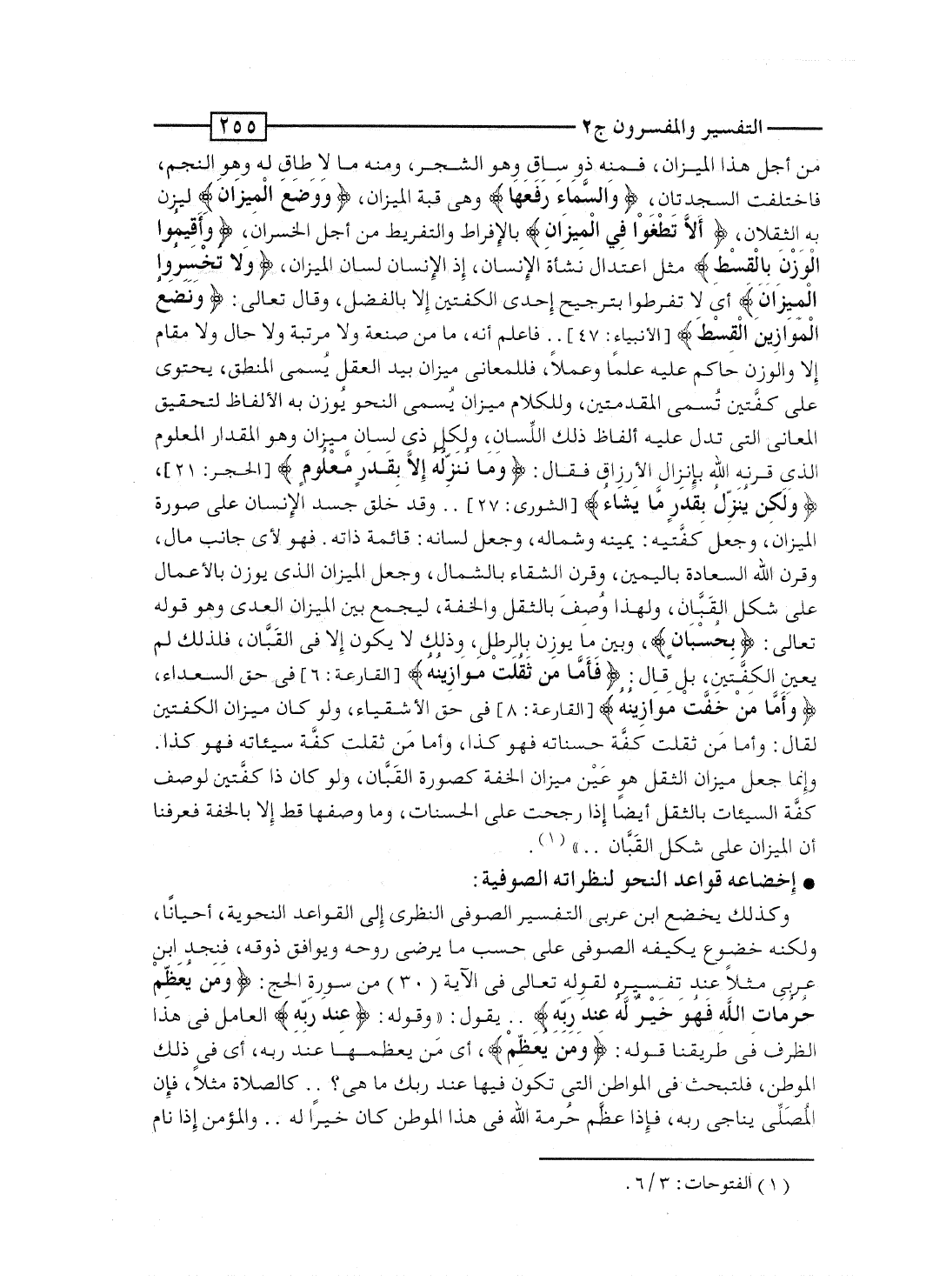 وكذلك يخضع ابن عربى التفسير الصوفى النظرى إلى القواعد النحوية، أحياناً، ولكنه خضوع يكيفه الصوفى على حسب ما يرضى روحه ويوافق ذوقه، فنجد ابن عربى مثلاً عند تفسيره لقوله تعالى فى الآية [30] من سورة الحج: {وَمَن يُعَظِّمْ حُرُمَاتِ الله فَهُوَ خَيْرٌ لَّهُ عِندَ رَبِّهِ} .. يقول: "وقوله: {عِندَ رَبِّهِ} العامل فى هذا الظرف فى طريقنا قوله: {وَمَن يُعَظِّمْ} ، أي مَن يعظمها عند ربه، أى فى ذلك الموطن، فلتبحث فى المواطن التى تكون فيها عند ربك ما هى؟.. كالصلاة مثلاً، فإن المُصَلِّى يناجى ربه، فإذا عظَّم حُرمة الله فى هذا الموطن كان خيراً له.. والمؤمن إذا نام