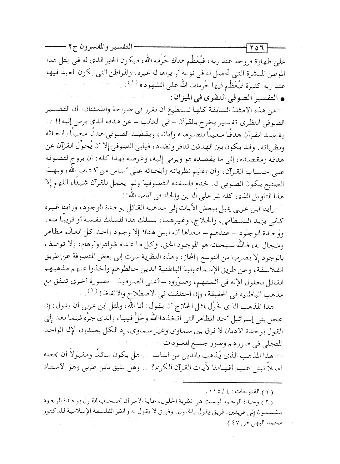 رأينا ابن عربى يميل ببعض الآيات إلى مذهبه القائل بوحدة الوجود، ورأينا غيره كأبى يزيد البسطامى، والحلاج، وغيرهما، يسلك هذا المسلك نفسه أو قريباً منه. ووحدة الوجود - عندهم - معناها أنه ليس هناك إلا وجود واحد كل العالَم مظاهر ومجال له، فالله سبحانه هو الموجود الحق، وكل ما عداه ظواهر وأوهام، ولا توصف بالوجود إلا بضرب من التوسع والمجاز، وهذه النظرية سرت إلى بعض المتصوفة عن طريق الفلاسفة، وعن طريق الإسماعيلة الباطنية الذين خالطوهم وأخذوا عنهم مذهبهم القائل بحلول الإله فى أئمتهم، وصوَّروه - أعنى الصوفية - بصورة أخرى تتفق مع مذهب الباطنية فى الحقيقة، وإن اختلفت فى الاصطلاح والألفاظ!