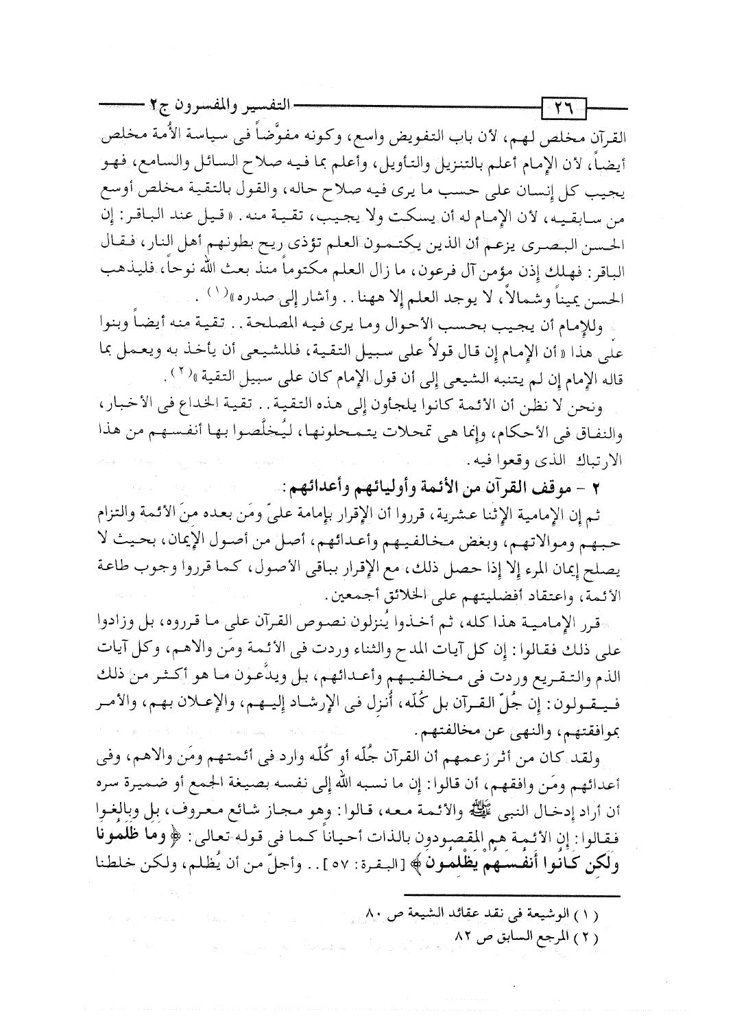وكل واحد من هذه الثلاثة يمكن أن يكون مخلصاً للخروج من هذا التناقض الذى وقع فى تفاسيرهم التى يروونها عن أئمتهم، فكون الإمام مفوَّضاً من قِبَلِ الله فى تفسير القرآن مخلص لهم، لأن باب التفويض واسع. وكونه مفوَّضاً فى سياسة الأُمة مخلص أيضاً، لأن الإمام أعلم بالتنزيل والتأويل، وأعلم بما فيه صلاح السائل والسامع، فهو يجيب كل إنسان على حسب ما يرى فيه صلاح حاله، والقول بالتقية مخلص أوسع من سابقيه، لأن الإمام له أن يسكت ولا يجيب، تقية منه. "قيل عند الباقر: إن الحسن البصرى يزعم أن الذين يكتمون العلم تؤذى ريح بطونهم أهل النار، فقال الباقر: فهلك إذن مؤمن آل فرعون، ما زال العلم مكتوماً منذ بعث الله نوحاً، فليذهب الحسن يميناً وشمالاً، لا يوجد العلم إلا ههنا.. وأشار إلى صدره".