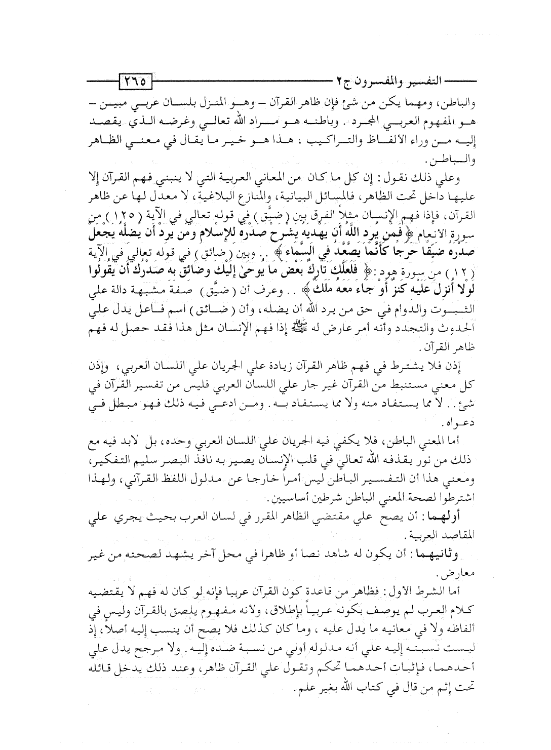 وعلى ذلك نقول: إن كل ما كان من المعانى العربية التى لا ينبنى فهم القرآن إلا عليها داخل تحت الظاهر، فالمسائل البيانية، والمنازع البلاغية، لا معدل لها عن ظاهر القرآن، فإذا فهم الإنسان مثلاً الفرق بين "ضَيِّق" فى قوله تعالى فى الآية [125] من سورة الأنعام: {فَمَن يُرِدِ الله أَن يَهْدِيَهُ يَشْرَحْ صَدْرَهُ لِلإِسْلاَمِ وَمَن يُرِدْ أَن يُضِلَّهُ يَجْعَلْ صَدْرَهُ ضَيِّقاً حَرَجاً كَأَنَّمَا يَصَّعَّدُ فِي السمآء} .. وبين "ضائق" فى قوله تعالى فى الآية [12] من سورة هود: {فَلَعَلَّكَ تَارِكٌ بَعْضَ مَا يوحى إِلَيْكَ وَضَآئِقٌ بِهِ صَدْرُكَ أَن يَقُولُواْ لَوْلاَ أُنزِلَ عَلَيْهِ كَنزٌ أَوْ جَآءَ مَعَهُ مَلَكٌ} .. وعرف أن "ضيِّق" صفة مشبهة دالة على الثبوت والدوام فى حق مَن يُرد الله أن يضله، وأن "ضائق" اسم فاعل يدل على الحدوث والتجدد وأنه أمر عارض له صلى الله عليه وسلم. إذا فهم الإنسان مثل هذا فقد حصل له فهم ظاهر القرآن.