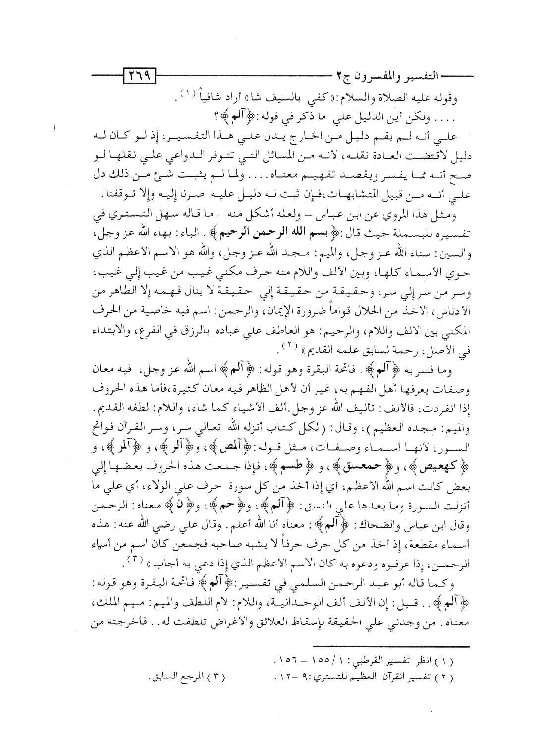 وما فسَّر به {آلم} . فاتحة البقرة وهو قوله: {آلم} اسم الله عزَّ وجَلَّ، فيه معان وصفات يعرفها أهل الفهم به، غير أن لأهل الظاهر فيه معان كثيرة، فأما هذه الحروف إذا انفردت، فالألف: تأليف الله عَزَّ وجَلَّ. ألَّفَ الأشياء كما شاء، واللام: لطفه القديم، والميم: مجده العظيم"، وقال: "لكل كتاب أنزله الله تعالى سر، وسر القرآن فواتح السور، لأنها أسماء وصفات، مثل قوله: {آلمص} ، و {آلر} ، و {آلمر} ، و {كهيعص} ، و {حمعسق} ، و {طسم} ، فإذا جمعت هذه الحروف بعضها إلى بعض كانت اسم الله الأعظم، أى إذا أخذ من كل سورة حرف على الولاء، أى على ما أنزلت السورة وما بعدها على النسق: {آلم} ، و {حم} ، و {ن} معناه: الرحمن. وقال ابن عباس والضحَّاك: {آلم} : معناه أنا الله أعلم. وقال علىّ رضى الله عنه: هذه أسماء مقطعة، إذا أخذ من كل حرف حرفاً لا يشبه صاحبه فجُمِعن كان اسم من أسماء الرحمن، إذا عرفوه ودعوه به كان الاسم الأعظم الذى إذا دُعِىَ به أجاب".
