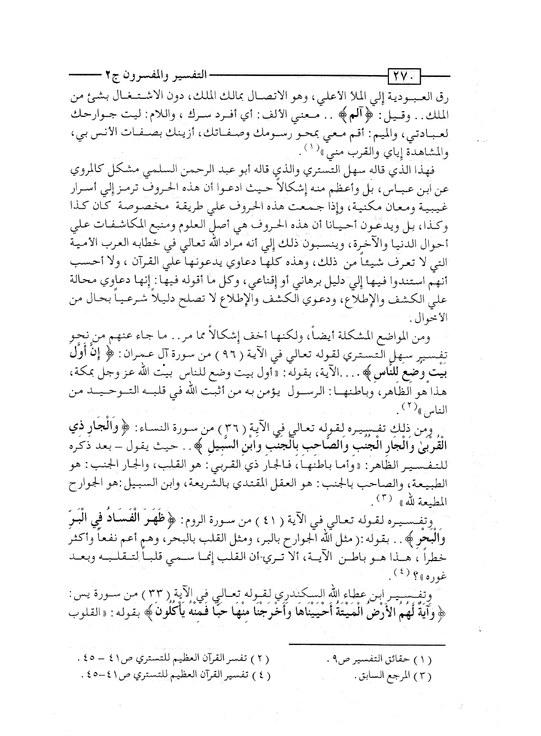 فهذا الذى قاله سهل التسترى والذى قاله أبو عبد الرحمن السلمى مشكل كالمروى عن ابن عباس، بل وأعظم منه إشكالاً حيث ادَّعوا أن هذه الحروف ترمز إلى أسرار غيبية ومعان مكنية، وإذا جُمعت هذه الحروف على طريقة مخصوصة كان كذا وكذا، بل ويدَّعون أحياناً أن هذه الحروف هى أصل العلوم ومنبع المكاشفات على أحوال الدنيا والآخرة، وينسبون ذلك إلى أنه مراد الله تعالى فى خطابه العرب الأُميِّة التى لا تعرف شيئاً من ذلك، وهذه كلها دعاوى يدَّعونها على القرآن، ولا أحسب أنهم استندوا فيها إلى دليل برهانى أو إقناعى، وكل ما أقوله فيها: إنها دعاوى محالة على الكشف والاطلاع، ودعوى الكشف والاطلاع لا تصلح دليلاً شرعياً بحال من الأحوال.