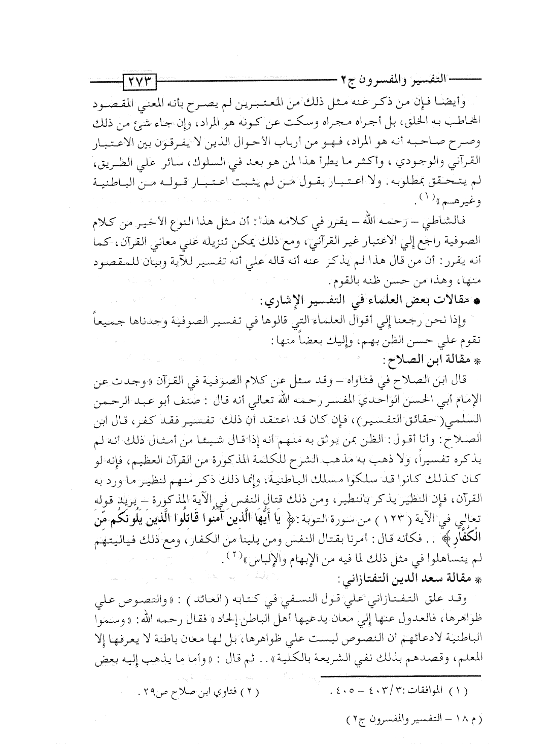 قال ابن الصلاح فى فتاواه - وقد سُئِل عن كلام الصوفية فى القرآن: "وجدت عن الإمام أبى الحسن الواحدى المفسِّر رحمه الله تعالى أنه قال: صنَّف أبو عبد الرحمن السلمى "حقائق التفسير"، فإن كان قد اعتقد أن ذلك تفسير فقد كفر. قال ابن الصلاح: وأنا أقول: الظن بمن يوثق به منهم أنه إذا قال شيئاً من أمثال ذلك أنه لم يذكره تفسيراً، ولا ذهب به مذهب الشرح للكلمة المذكورة من القرآن العظيم، فإنه لو كان كذلك كانوا قد سلكوا مسلك الباطنية، وإنما ذلك ذكر منهم لنظير ما ورد به القرآن، فإن النظير يُذكر بالنظير، ومن ذلك قتال النفس فى الآية المذكورة - يريد قوله تعالى فى الآية [123] من سورة التوبة: {ياأيها الذين آمَنُواْ قَاتِلُواْ الذين يَلُونَكُمْ مِّنَ الكفار} .. فكأنه قال: أمرنا بقتال النفس ومَن يلينا من الكفار، ومع ذلك فياليتهم لم يتساهلوا فى مثل ذلك لما فيه من الإبهام والإلباس".