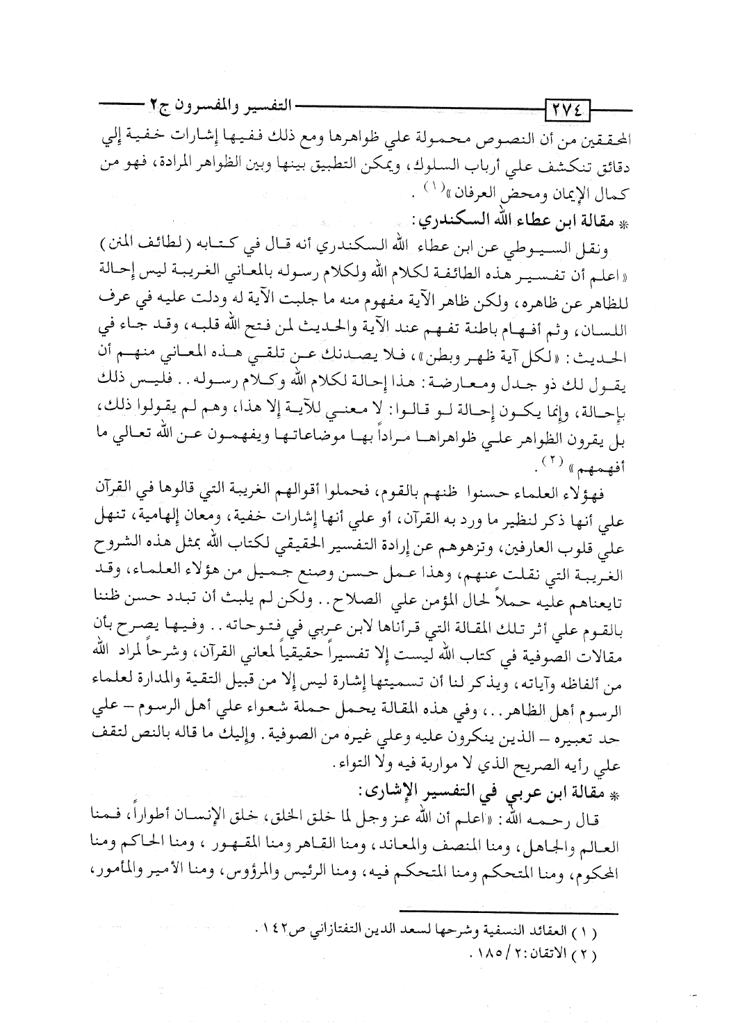 ونقل السيوطى عن ابن عطاء الله السكندرى أنه قال فى كتابه "لطائف المنن": "اعلم أن تفسير هذه الطائفة لكلام الله وكلام رسوله بالمعانى الغريبة ليس إحالة للظاهر عن ظاهره، ولكن ظاهر الآية مفهوم منه ما جلبت الآية له ودلَّت عليه فى عُرف اللِّسان، وثَمَّ أفهام باطنة تُفهَم عند الآية والحديث لمن فتح الله قلبه، وقد جاء فى الحديث: "لكل آية ظهر وبطن"، فلا يصدنك عن تلقى هذه المعانى منهم أن يقول لك ذو جدل ومعارضة: هذا إحالة لكلام الله وكلام رسوله.. فليس ذلك بإحالة، وإنما يكون إحالة لو قالوا: لا معنى للآية إلا هذا، وهم لم يقولوا ذلك، بل يقرون الظواهر على ظواهرها مراداً بها موضوعاتها ويفهمون عن الله تعالى ما أفهمهم".