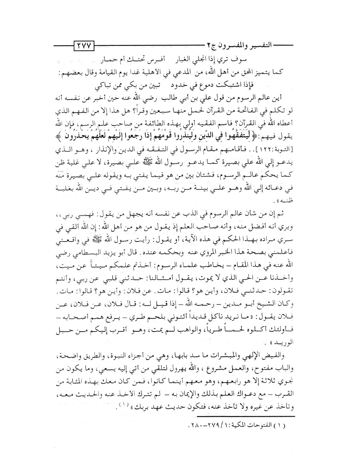 ثم إن من شأن عالم الرسوم فى الذب عن نفسه أنه يُجَهِّل مَن يقول: فهمَّنى ربى، ويرى أنه أفضل منه، وأنه صاحب العلم إذ يقول مَن هو من أهل الله: إن الله ألقى فى سِرِّى مراده بهذا الحكم فى هذه الآية، أو يقول: رأيت رسول الله صلى الله عليه وسلم فى واقعتى فأعلمنى بصحة هذا الخبر المروى عنه وبحكمه عنده. قال أبو يزيد البسطامى رضى الله عنه فى هذا المقام - يخاطب علماء الرسوم: أخذتم علمكم ميتاً عن ميت، وأخذنا عن الحى الذى لا يموت، يقول أمثالنا: حدَّثنى قلبى عن ربى، وأنتم تقولون: حدَّثنى فلان، وأين هو؟ قالوا: مات. عن فلان: وأين هو؟ قالوا: مات. وكان الشيخ أبو مدين - رحمه الله - إذا قيل له: قال فلان، عن فلان، عن فلان، يقول: "ما نريد نأكل قديداً، هاتوا ائتونى بلحم طرى - يرفع همم أصحابه - فأُولئك أكلوه لحماً طرياً، والواهب لم يمت، وهو أقرب إليكم من حبل الوريد".