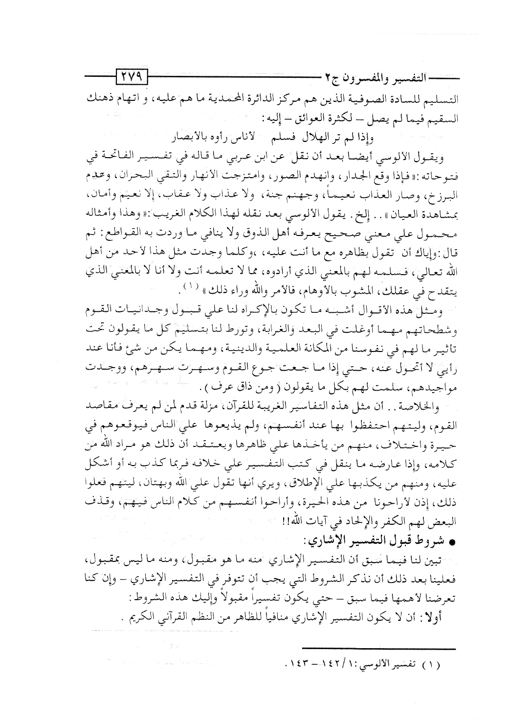 تبين لنا فيما سبق أن التفسير الإشارى منه ما هو مقبول، ومنه ما ليس بمقبول، فعلينا بعد ذلك أن نذكر الشروط التى يجب أن تتوفر فى التفسير الإشارى - وإن كنا تعرَّضنا لأهمها فيما سبق - حتى يكون تفسيراً مقبولاً.. وإليك هذه الشروط: