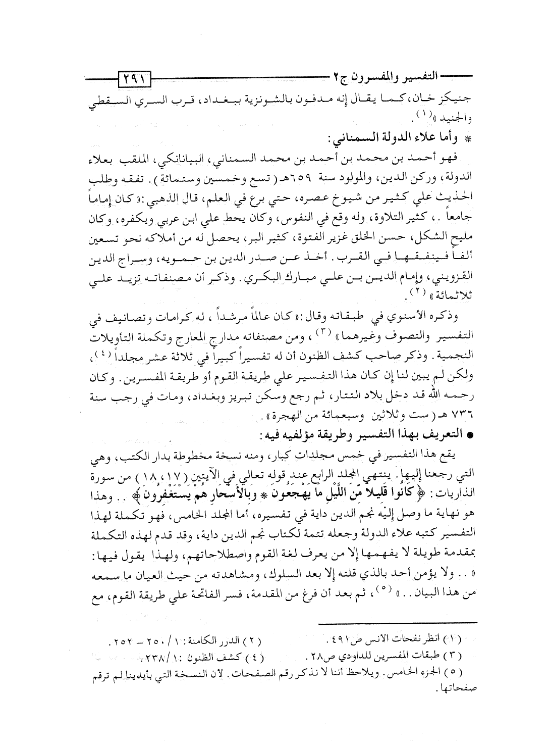 يقع هذا التفسير فى خمس مجلدات كبار، ومنه نسخة مخطوطة بدار الكتب، وهى التى رجعنا إليها. ينتهى المجلد الرابع عند قوله تعالى فى الآيتين [17، 18] من سورة الذاريات: {كَانُواْ قَلِيلاً مِّن الليل مَا يَهْجَعُونَ * وبالأسحار هُمْ يَسْتَغْفِرُونَ} .. وهذا هو نهاية ما وصل إليه نجم الدين داية فى تفسيره، أما المجلد الخامس، فهو تكملة لهذا التفسير، كتبه علاء الدولة وجعله تتمة لكتاب نجم الدين داية، وقد قدَّم لهذه التكملة بمقدمة طويلة لا يفهمها إلا مَن يعرف لغة القوم واصطلاحاتهم، ولهذا يقول فيها: ".. ولا يؤمن أحد بالذى قلته إلا بعد السلوك، ومشاهدته من حيث العيان ما سمعه من هذا البيان.. "، ثم بعد أن فرغ من المقدمة، فسَّر الفاتحة على طريقة القوم، مع