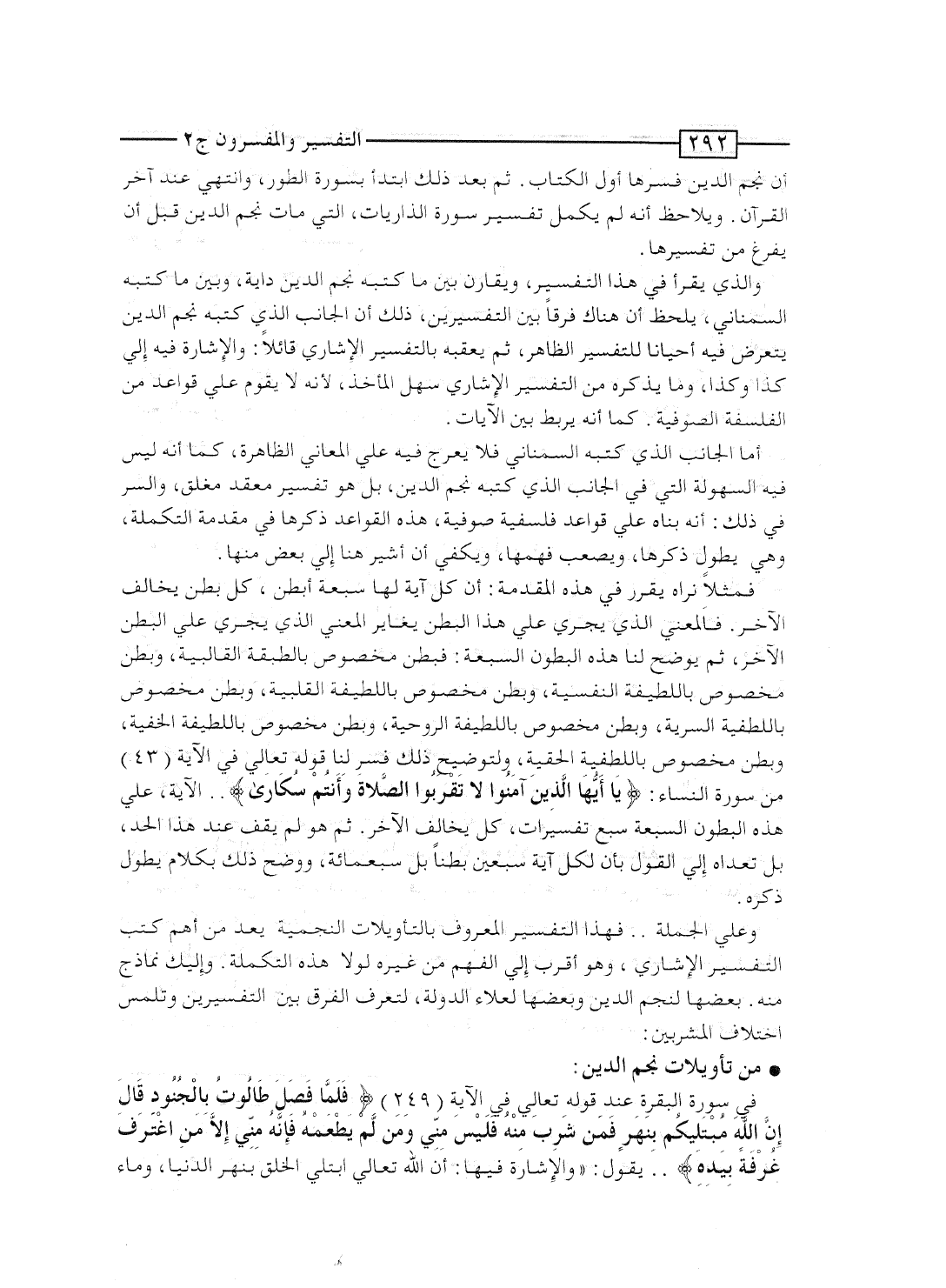 وعلى الجملة.. فهذا التفسير المعروف بالتأويلات النجمية يُعَد من أهم كتب التفسير الإشارى، وهو أقرب إلى الفهم من غيره لولا هذه التكملة. وإليك نماذج منه. بعضها لنجم الدين وبعضها لعلاء الدولة، لتعرف الفرق بين التفسيرين وتلمس اختلاف المشربين: