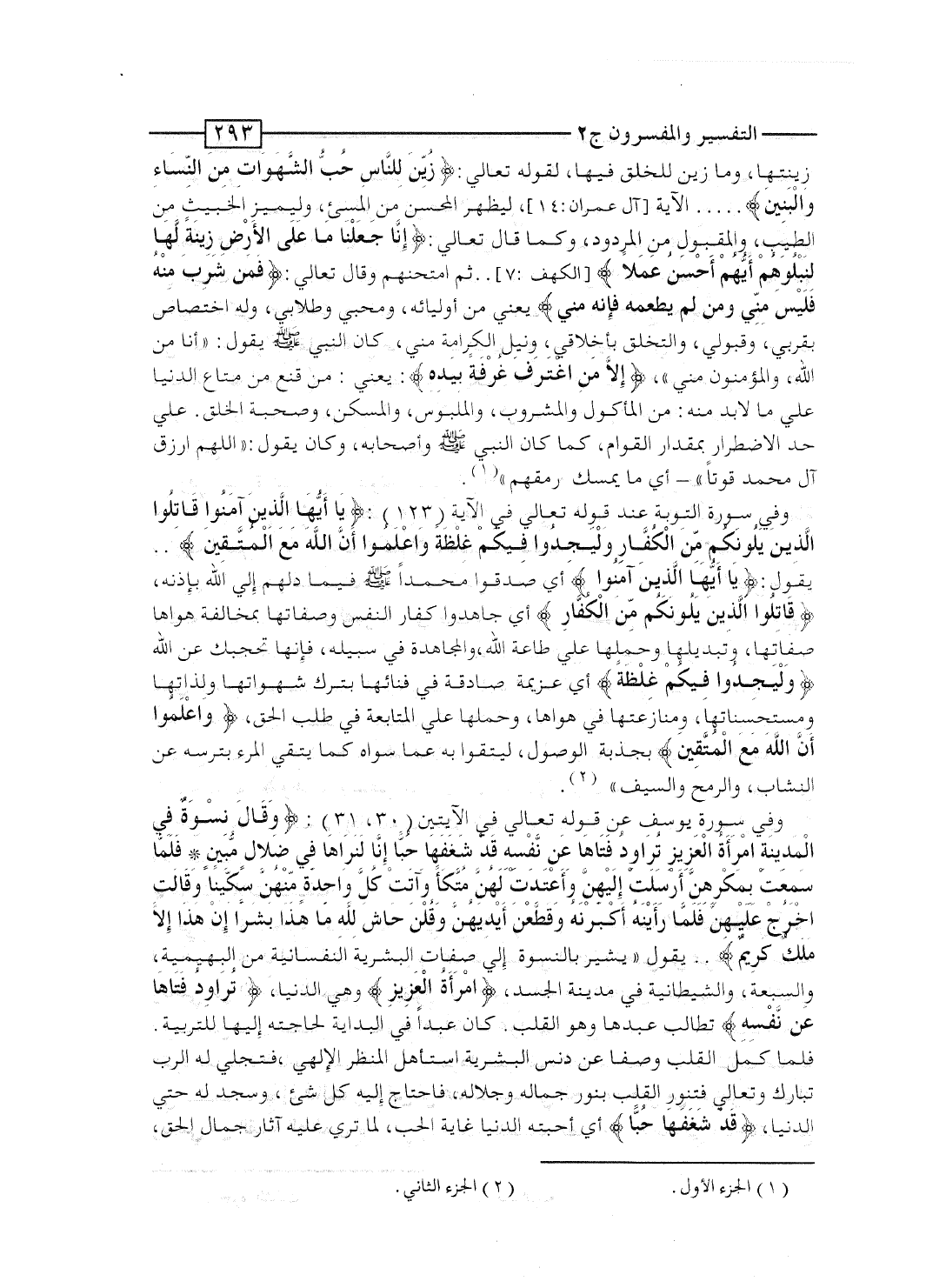 وفى سورة التوبة عند قوله تعالى فى الآية [123] : {ياأيها الذين آمَنُواْ قَاتِلُواْ الذين يَلُونَكُمْ مِّنَ الكفار وَلْيَجِدُواْ فِيكُمْ غِلْظَةً واعلموا أَنَّ الله مَعَ المتقين} .. يقول: {ياأيها الذين آمَنُواْ} أي صدَّقوا محمداً صلى الله عليه وسلم فيما دلَّهم إلى الله بإذنه، {قَاتِلُواْ الذين يَلُونَكُمْ مِّنَ الكفار} أى جاهدوا كفار النفس وصفاتها بمخالفة هواها صفاتها، وتبديلها وحملها على طاعة الله، والمجاهدة فى سبيله، فإنها تحجبك عن الله، {وَلْيَجِدُواْ فِيكُمْ غِلْظَةً} أى عزيمة صادقة فى فنائها بترك شهواتها ولذَّاتها ومستحسناتها، ومنازعتها فى هواها، وحملها على المتابعة فى طلب الحق، {واعلموا أَنَّ الله مَعَ المتقين} بجذبة الوصول، ليتقوا به عما سواه، كما يتقى المرء بترسه عن النشاب، والرمح والسيف".