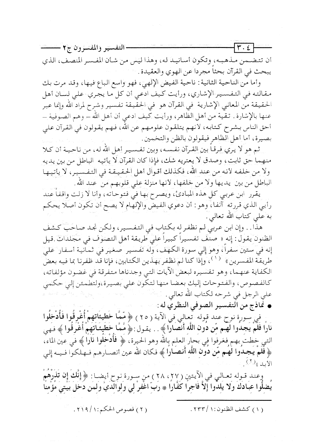 هذا.. وإن ابن عربى لم نظفر له بكتاب فى التفسير، ولكن نجد صاحب كشف الظنون يقول: إنه "صنَّف تفسيراً كبيراً على طريقة أهل التصوف فى مجلدات. قيل إنه فى ستين سِفْراً، وهو إلى سورة الكهف، وله تفسير صغير فى ثمانية أسفار على طريقة المفسِّرين"، وإذا كنا لم نظفر بهذين الكتابين، فإنَّا قد ظفرنا بما فيه بعض الكفاية عنهما، وهو تفسيره لبعض الآيات التى وجدناها متفرقة فى غضون مؤلفاته، كالفصوص، والفتوحات. إليك بعضاً منها لتكون على بصيرة، ولتطمئن إلى حكمى على الرجل فى شرحه لكتاب الله تعالى: