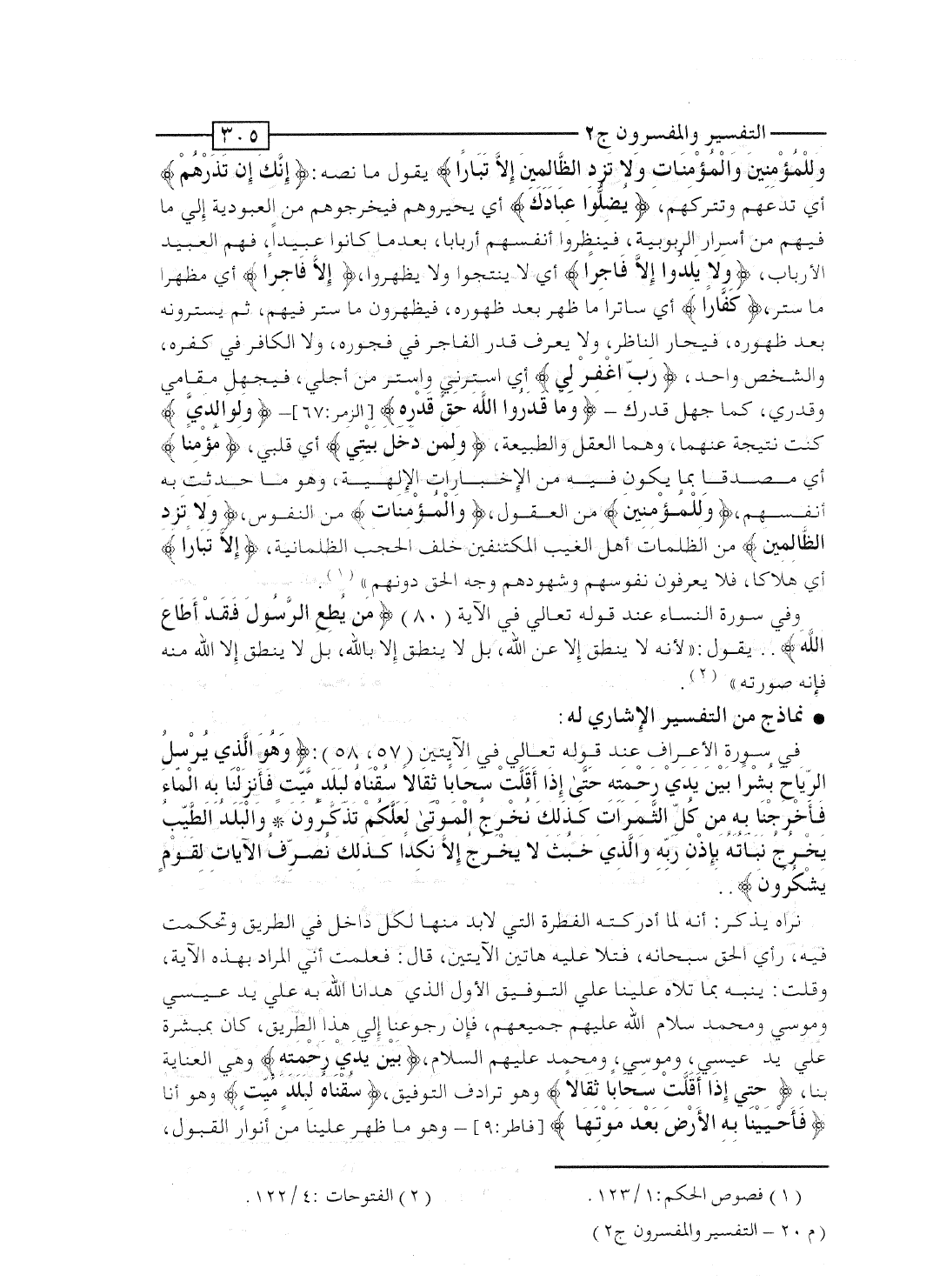 وَلِلْمُؤْمِنِينَ والمؤمنات وَلاَ تَزِدِ الظالمين إِلاَّ تَبَاراً} يقول ما نصه: {إِنَّكَ إِن تَذَرْهُمْ} أى تدعهم وتتركهم، {يُضِلُّواْ عِبَادَكَ} أي يحيروهم فيخرجوهم من العبودية إلى ما فيهم من أسرَار الربوبية، فينظروا أنفسهم أرباباً، بعدما كانوا عبيداً، فهم العبيد الأرباب، {وَلاَ يلدوا} أي لا ينتجوا ولا يظهروا، {إِلاَّ فَاجِراً} أى مظهراً ما سُتِر، {كَفَّاراً} أى ساتراً ما ظهر بعد ظهوره، فيظهرون ما سُتِر فيهم، ثم يسترونه بعد ظهوره، فيحار الناظر، ولا يعرف قدر الفاجر فى فجوره، ولا الكافر في كفره، والشخص واحد، {رَّبِّ اغفر لِي} أي استرنى واستر من أجلى، فيُجهَل مقامى وقدرى، كما جُهِل قَدركَ - {وَمَا قَدَرُواْ الله حَقَّ قَدْرِهِ} [الزمر: 67]- {وَلِوَالِدَيَّ} كنت نتيجة عنهما، وهما العقل والطبيعة، {وَلِمَن دَخَلَ بَيْتِيَ} أى قلبى، {مُؤْمِناً} أى مصدِّقاً بما يكون فيه من الإخبارات الإلهية، وهو ما حدَّثت به أنفسهم، {وَلِلْمُؤْمِنِينَ} من العقول، {والمؤمنات} من النفوس، {وَلاَ تَزِدِ الظالمين} من الظلمات أهل الغيب المكتنفين خلف الحُجُب الظلمانية، {إِلاَّ تَبَاراً} أى هلاكاً، فلا يعرفون نفوسهم وشهودهم وجه الحق دونهم".