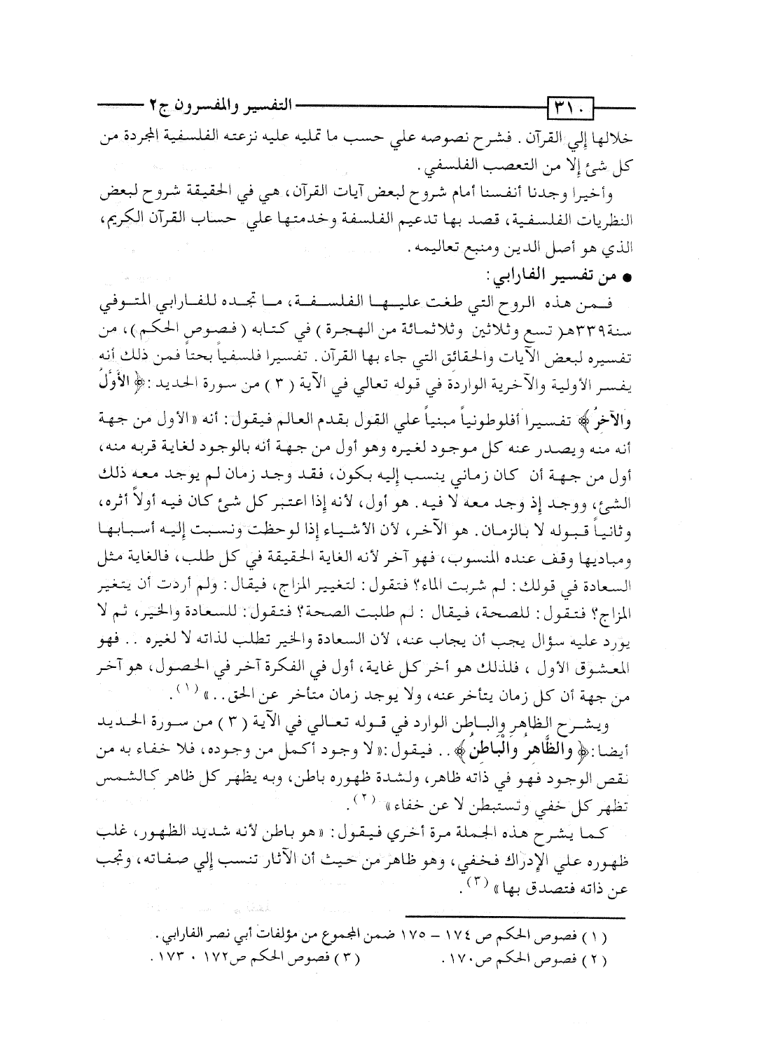 فمن هذه الروح التى طغت عليها الفلسفة، ما تجده للفارابى المتوفى سنة 339 هـ (تسع وثلاثين وثلاثمائة من الهجرة) فى كتابه "فصوص الحكم"، من تفسيره لبعض الآيات والحقائق التى جاء بها القرآن. تفسيراً فلسفياً بحتاً، فمن ذلك أنه يُفسِّر الأوَّلية والآخرية الواردة فى قوله تعالى فى الآية [3] من سورة الحديد: {هُوَ الأول والآخر} تفسيراً أفلوطونياً مبنياً على القول بِقدَم العالَم فيقول: إنه " الأول من جهة أنه منه ويصدر عنه كل موجود لغيره، وهو أول من جهة أنه بالوجود لغاية قُربه منه، أول من جهة أنَّ كان زمانى يُنسب إليه بكون، فقد وُجِدَ زمان لم يوجد معه ذلك الشىء، ووُجِدَ إذ وُجِدَ معه لا فيه. هو أول، لأنه إذا اعتبر كل شىء كان فيه أولا أثره، وثانياً قبوله لا بالزمان. هو الآخر، لأن الأشياء إذا لوحظت ونُسِبَتْ إليه أسبابها ومباديها وقف عنده المنسوب، فهو آخر لأنه الغاية الحقيقية فى كل طلب، فالغاية مثل السعادة فى قولك: لِمَ شربت الماء؟ فتقول: لتغيير المزاج، فيقال: ولِمَ أردت أن يتغير المزاج؟ فتقول: للصحة، فيقال: لِمَ طلبت الصحة؟ فتقول: للسعادة والخير، ثم لا يورد عليه سؤال يجب أن يُجاب عنه، لأن السعادة والخير تُطلب لذاته لا لغيره.. فهو المعشوق الأولى، فلذلك هو آخر كل غاية، أول فى الفكرة آخر فى الحصول، هو آخر من جهة أن كل زمان يتأخر عنه، ولا يوجد زمان متأخر عن الحق.. ".