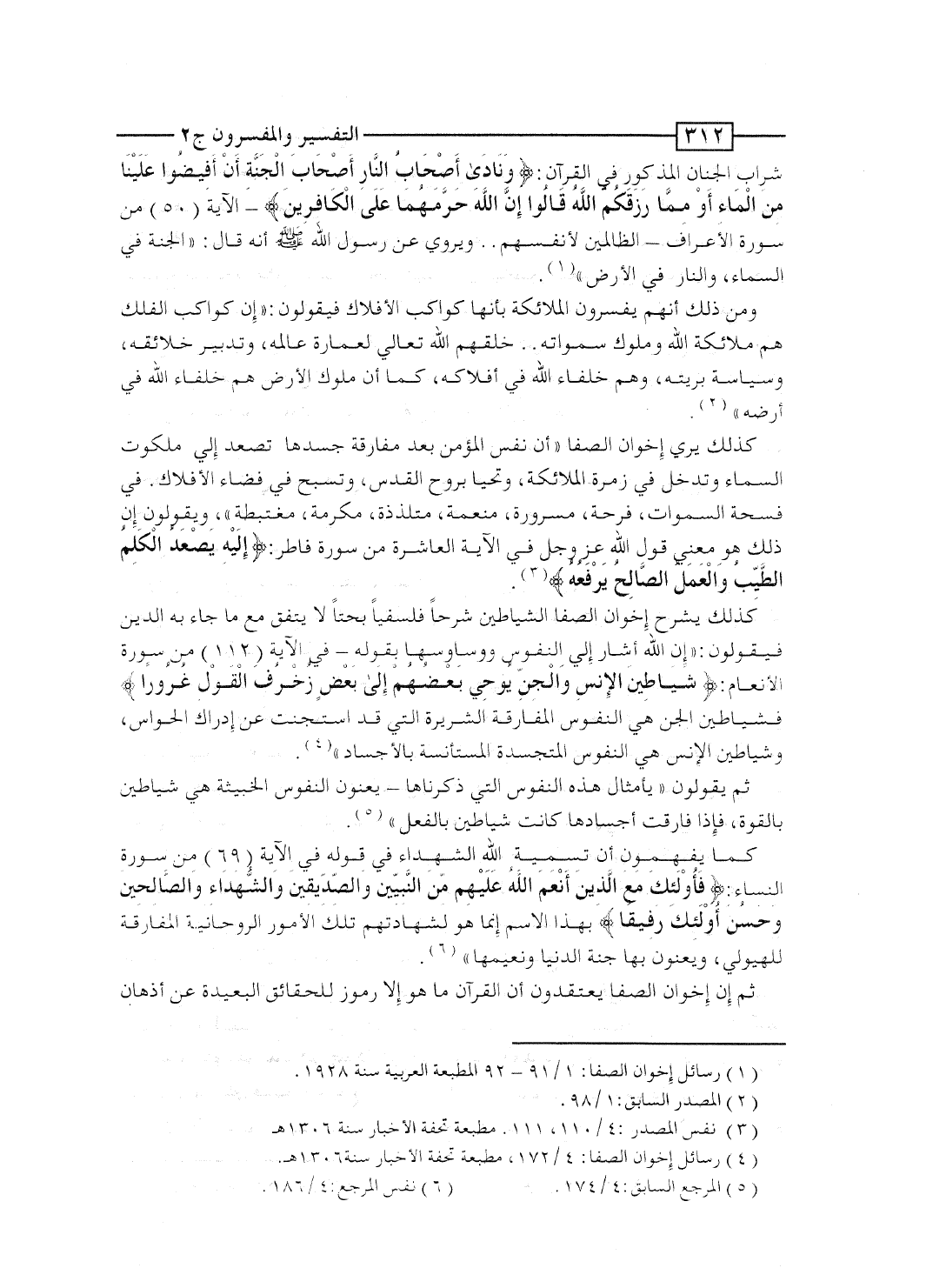 كما يفهمون أن تسمية الله الشهداء فى قوله فى الآية [69] من سورة النساء: {فأولائك مَعَ الذين أَنْعَمَ الله عَلَيْهِم مِّنَ النبيين والصديقين والشهدآء والصالحين وَحَسُنَ أولائك رَفِيقاً} بهذا الاسم إنما هو لشهادتهم تلك الأمور الروحانية المفارقة للهيولى، ويعنون بها جنَّة الدنيا ونعيمها.