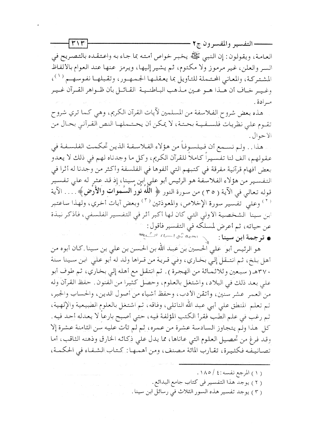 هذا.. ولم نسمع أن فيلسوفاً من هؤلاء الفلاسفة الذين تحكَّمت الفلسفة فى عقولهم، ألَّف لنا تفسيراً كاملاً للقرآن الكريم، وكل ما وجدناه لهم فى ذلك لا يعدو بعض أفهام قرآنية متفرَّقة فى كتبهم التى ألَّفوها فى الفلسفة. وأكثر مَن وجدنا له أثراً فى التفسير من هؤلاء الفلاسفة هو الرئيس أبو علىّ ابن سينا، إذ قد عُثِر له على تفسير قوله تعالى فى الآية [35] من سورة النور: {الله نُورُ السماوات} ... الآية وعلى تفسير سورة الإخلاص، والمعوذتين وبعض آيات أخرى، ولهذا سأعتبر ابن سينا الشخصية الأولى التى كان لها أكبر أثر فى التفسير الفلسفى، فأذكر نُبْذة عن حياته، ثم أعرض لمسلكه فى التفسير فأقول: