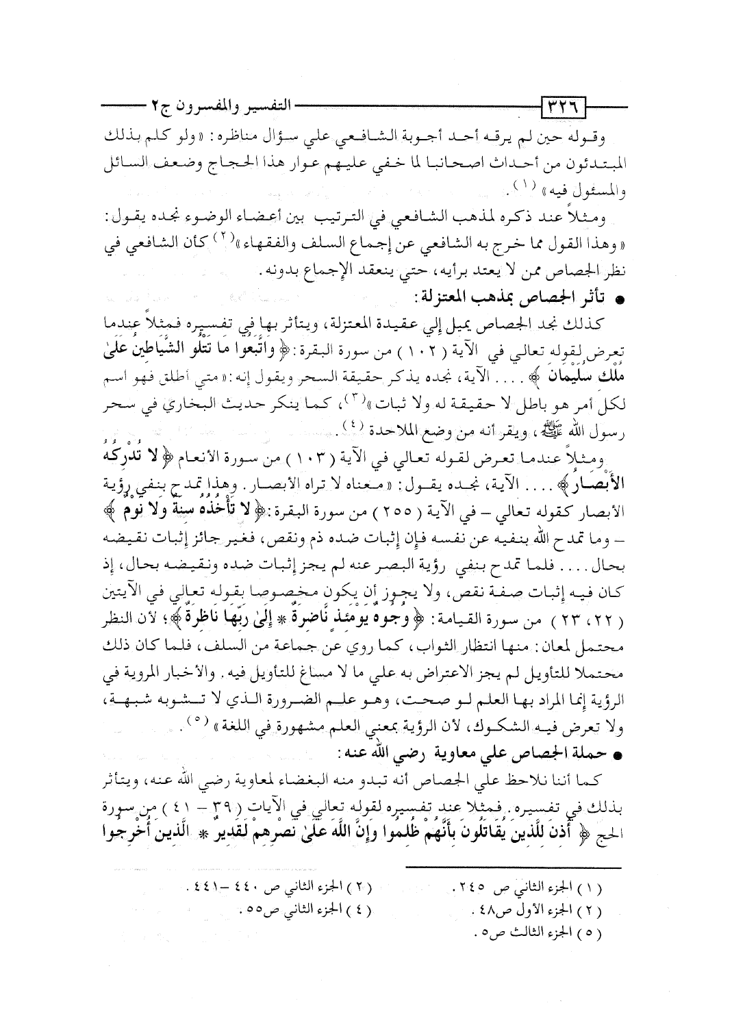كما أننا نلاحظ على الجصَّاص أنه تبدو منه البغضاء لمعاوية رضى الله عنه، ويتأثر بذلك فى تفسيره. فمثلاً عند تفسيره لقوله تعالى فى الآيات [39 - 41] من سورة الحج: {أُذِنَ لِلَّذِينَ يُقَاتَلُونَ بِأَنَّهُمْ ظُلِمُواْ وَإِنَّ الله على نَصْرِهِمْ لَقَدِيرٌ * الذين أُخْرِجُواْ مِن دِيَارِهِم بِغَيْرِ حَقٍّ} ... إلى قوله: {الذين إِنْ مَّكَّنَّاهُمْ فِي الأرض أَقَامُواْ الصلاة وَآتَوُاْ الزكاة وَأَمَرُواْ بالمعروف وَنَهَوْاْ عَنِ المنكر وَلِلَّهِ عَاقِبَةُ الأمور} .. يقول: ".. وهذه صفة الخلفاء الراشدين، الذين مكنهم الله فى الأرض وهم أبو بكر وعمر وعثمان وعلىّ رضى الله عنهم. وفيه الدلالة الواضحة على صحة إمامتهم، لإخبار الله تعالى بأنهم إذا مُكِّنوا فى الأرض قاموا بفروض الله عليهم، وقد مُكِّنوا فى الأرض فوجب أن يكونوا أئمة قائمين بأوامر الله منتهين عن زواجره ونواهيه، ولا يدخل معاوية فى هؤلاء، لأن الله إنما وصف بذلك المهاجرين الذين أُخرجوا