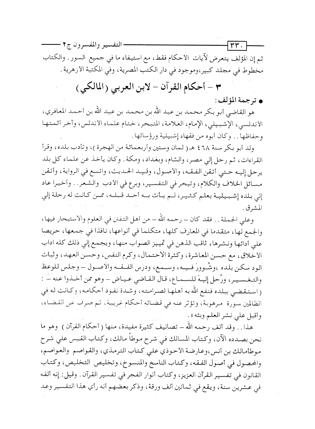هذا.. وقد ألّف رحمه الله - تصانيف كثيرة مفيدة، منها "أحكام القرآن"، وهو ما نحن بصدده الآن، وكتاب المسالك فى شرح موطأ مالك، وكتاب القبس على شرح موطأ مالك بن أنس، وعارضة الأحوذى على كتاب الترمذى، والقواصم والعواصم، والمحصول فى أُصول الفقه، وكتاب الناسخ والمنسوخ، وتخليص التلخيص، وكتاب القانون فى تفسير القرآن العزيز، وكتاب أنوار الفجر فى تفسير القرآن. قيل: إنه ألّفه فى عشرين سنة، ويقع فى ثمانين ألف ورقة، وذكر بعضهم أنه رأى هذا التفسير وعَدَّ