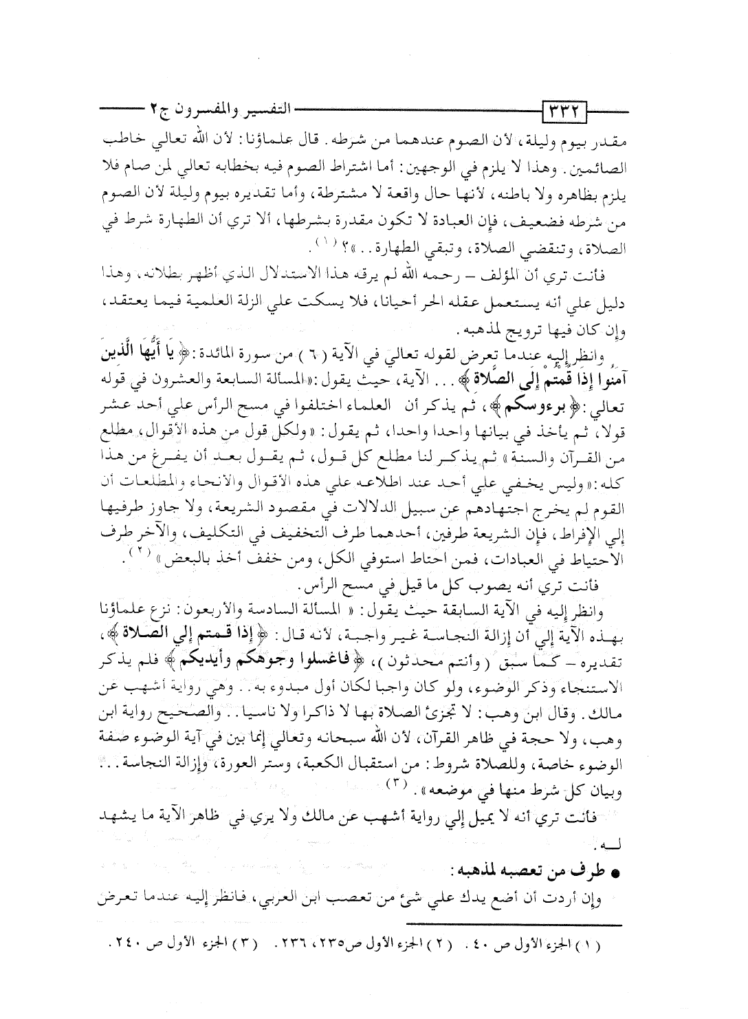 وانظر إليه عندما تعرَّض لقوله تعالى فى الآية [6] من سورة المائدة: {يَا أَيُّهَا الذين آمَنُواْ إِذَا قُمْتُمْ إِلَى الصلاة} ... الآية، حيث يقول: "المسألة السابعة والعشرون فى قوله تعالى: {بِرُءُوسِكُمْ} ، ثم يذكر أن العلماء اختلفوا فى مسح الرأس على أحد عشر قولاً، ثم يأخذ فى بيانها واحداً واحداً، ثم يقول: "ولكل قول من هذه الأقوال مطلع من القرآن والسُّنَّة"، ثم يذكر لنا مطلع كل قول، ثم يقول بعد أن يفرغ من هذا كله: "وليس يخفى على أحد عند اطلاعه على هذه الأقوال والأنحاء والمطلعات أن القوم لم يخرج اجتهادهم عن سبيل الدلالات فى مقصود الشريعة، ولا جاوز طرفيها إلى الإفراط، فإن للشريعة طرفين، أحدهما طرف التخفيف فى التكليف، والآخر طرف الاحتياط فى العبادات، فمَن احتاط استوفى الكل، ومَن خفف أخذ بالبعض.. ".