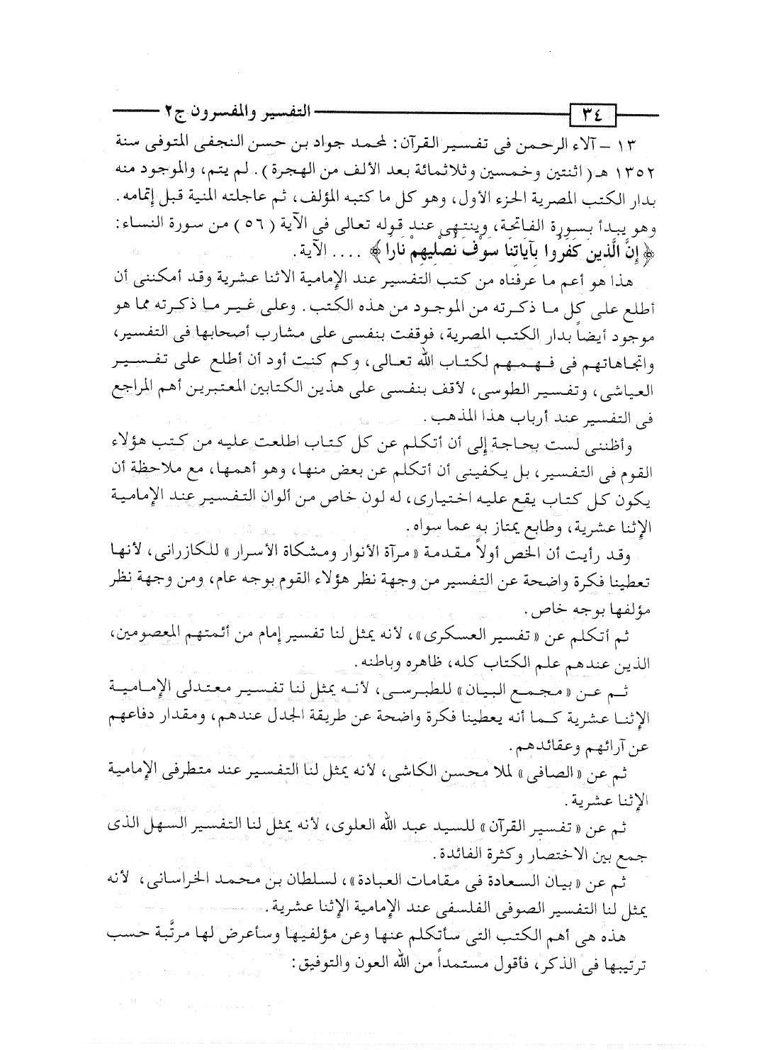 13- آلاء الرحمن فى تفسير القرآن: لمحمد جواد بن الحسن النجفى المتوفى سنة 1352 هـ (اثنتين وخمسين وثلاثمائة بعد الألف من الهجرة) . لم يتم، والموجود منه بدار الكتب المصرية الجزء الأول، وهو كل ما كتبه المؤلف، ثم عاجلته المنية قبل إتمامه. وهو يبدأ بسورة الفاتحة، وينتهى عند قوله تعالى فى الآية [56] من سورة النساء: {إِنَّ الذين كَفَرُواْ بِآيَاتِنَا سَوْفَ نُصْلِيهِمْ نَاراً} ... . الآية.