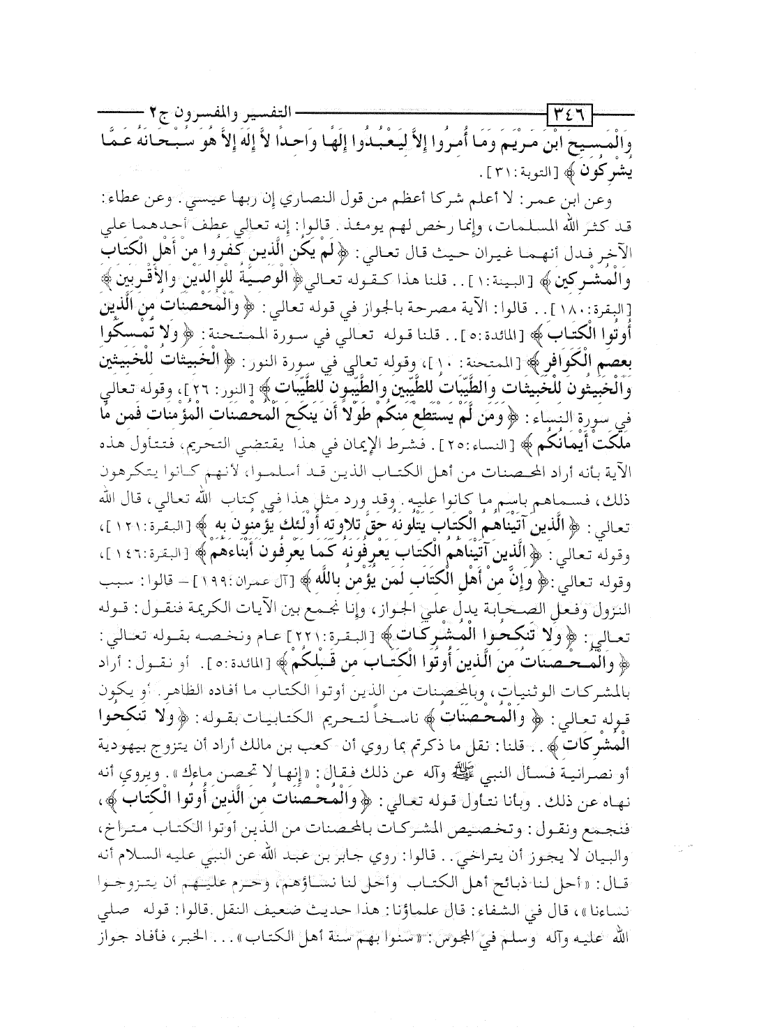 إلى قوله تعالى: {سُبْحَانَهُ عَمَّا يُشْرِكُونَ} [التوبة: 31] . وعن ابن عمر: لا أعلم شركاً أعظم من قول النصارى إن ربها عيسى. وعن عطاء: قد كثَّر الله المسلمات، وإنما رُخِّص لهم يومئذ. قالوا: إنه تعالى عطف أحدهما على الآخر فدل أنهما غيران حيث قال تعالى: {لَمْ يَكُنِ الذين كَفَرُواْ مِنْ أَهْلِ الكتاب والمشركين} [البينة: 1] .. قلنا: هذا كقوله تعالى: {الوصية لِلْوَالِدَيْنِ والأقربين} [البقرة: 180] .. قالوا: الآية مُصرِّحة بالجواز فى قوله تعالى: {والمحصنات مِنَ الذين أُوتُواْ الكتاب} [المائدة: 5] .. قلنا: قوله تعالى فى سورة الممتحنة: {وَلاَ تُمْسِكُواْ بِعِصَمِ الكوافر} [الممتحنة: 10] ، وقوله تعالى فى سورة النور: {الخبيثات لِلْخَبِيثِينَ والخبيثون لِلْخَبِيثَاتِ والطيبات لِلطَّيِّبِينَ والطيبون لِلْطَّيِّبَاتِ}