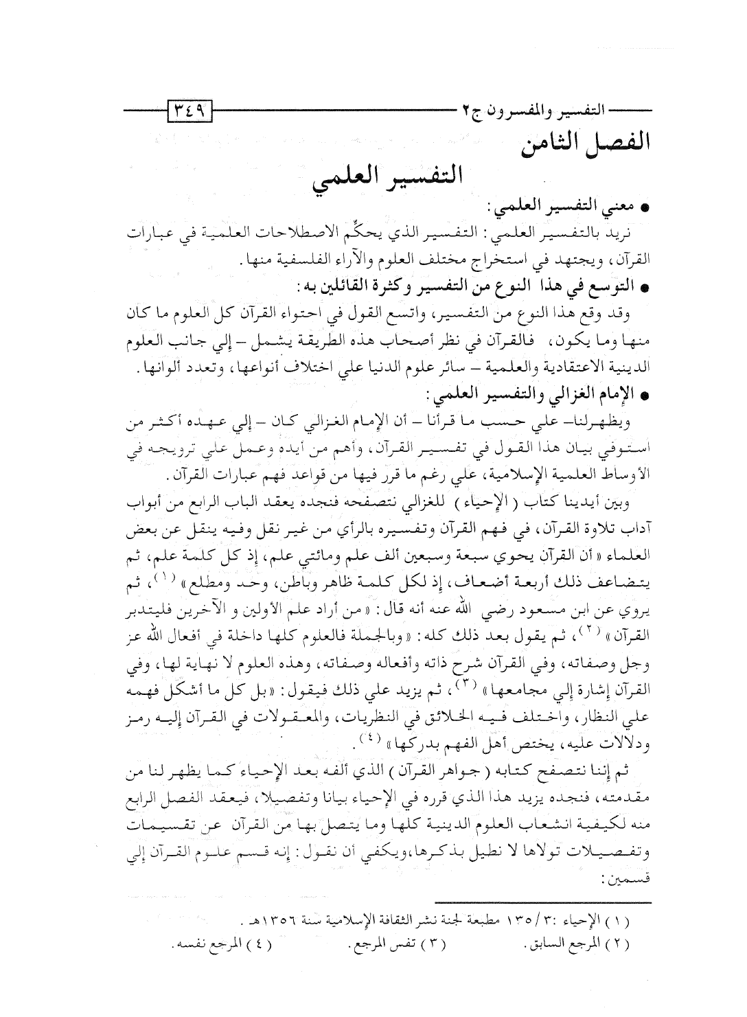وبين أيدينا كتاب "الإحياء" للغزالى نتصفحه فنجده يعقد الباب الرابع من أبواب آداب تلاوة القرآن، فى فهم القرآن وتفسيره بالرأى من غير نقل. وفيه ينقل عن بعض العلماء "أن القرآن يحوى سبعة وسبعين ألف علم ومائتى علم، إذ كل كلمة علم، ثم يتضاعف ذلك أربعة أضعاف، إذ لكل كلمة ظاهر وباطن، وحد ومطلع"، ثم يروى عن ابن مسعود رضى الله عنه أنه قال: "مَن أراد علم الأوَّلين والآخرين فليتدبر القرآن"، ثم يقول بعد ذلك كله: "وبالجملة فالعلوم كلها داخلة فى أفعال الله عَزَّ وجَلَّ وصفاته، وفى القرآن شرح ذاته وأفعاله وصفاته، وهذه العلوم لا نهاية لها، وفى القرآن إشارة إلى مجامعها"، ثم يزيد على ذلك فيقول: "بل كل ما أشكل فهمه على النُظَّار، واختلف فيه الخلائق فى النظريات، والمعقولات، فى القرآن إليه رمز ودلالات عليه، يختص أهل الفهم بدركها".