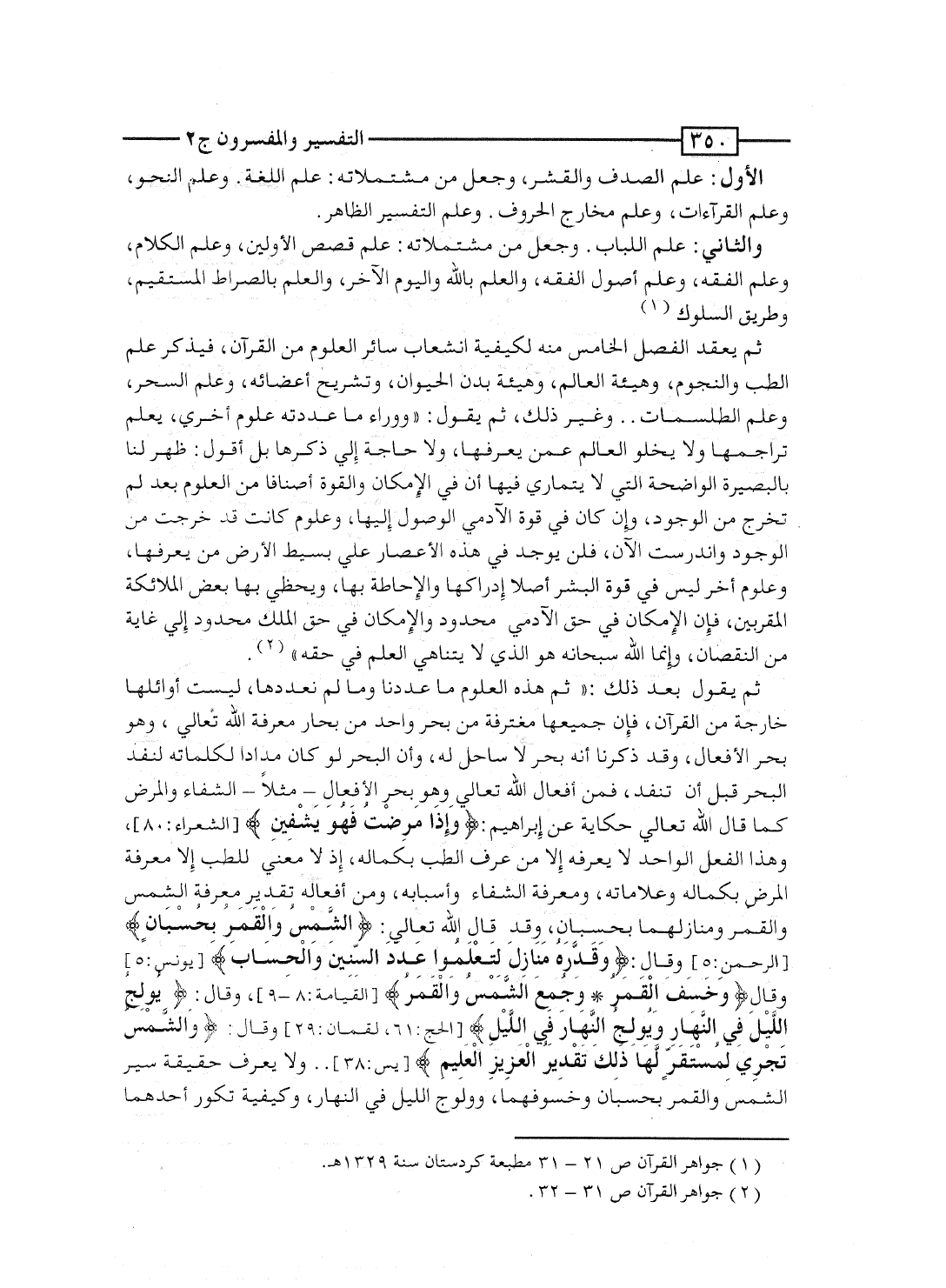 ثم يقول بعد ذلك: "ثم هذه العلوم ما عددنا وما لم نعددها، ليست أوائلها خارجة من القرآن، فإن جميعها مغترفة من بحر واحد من بحار معرفة الله تعالى، وهو بحر الأفعال، وقد ذكرنا أنه بحر لا ساحل له، وأن البحر لو كان مِدَاداً لكلماته لنَفِدَ البحر قبل أن تنفد، فمن أفعال الله تعالى وهو بحر الأفعال - مثلاً - الشفاء والمرض كما قال الله تعالى حكاية عن إبراهيم: {وَإِذَا مَرِضْتُ فَهُوَ يَشْفِينِ} [الشعراء: 80] ، وهذا الفعل الواحد لا يعرفه إلا مَن عرف الطب بكماله، إذ لا معنى للطب إلا معرفة المرض بكماله وعلاماته، ومعرفة الشفاء وأسبابه، ومن أفعاله تقدير معرفة الشمس والقمر ومنازلهما بُحسْبان، وقد قال الله تعالى: {الشمس والقمر بِحُسْبَانٍ} [الرحمن: 5] ، وقال: {وَقَدَّرَهُ مَنَازِلَ لِتَعْلَمُواْ عَدَدَ السنين والحساب} [يونس: 5] ، وقال: {وَخَسَفَ القمر * وَجُمِعَ الشمس والقمر} [القيامة: 8-9] ، وقال: {يُولِجُ الليل فِي النهار وَيُولِجُ النهار فِي الليل} [الحج: 61، لقمان: 29] وقال: {والشمس تَجْرِي لِمُسْتَقَرٍّ لَّهَا ذَلِكَ تَقْدِيرُ العزيز العليم} [يس: 38] .. ولا يعرف حقيقة سير الشمس والقمر بحسبان وخسوفهما، وولوج الليل فى النهار، وكيفية تكور أحدهما