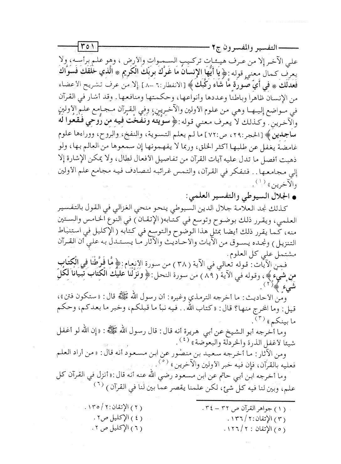كذلك نجد العلامة جلال الدين السيوطى ينحو منحى الغزالى فى القول بالتفسير العلمى، ويقرر ذلك بوضوح وتوسع فى كتابه "الإتقان" فى النوع الخامس والستين منه، كما يقرر ذلك أيضاً بمثل هذا الوضوح والتوسع فى كتابه "الإكليل فى استنباط التنزيل" ونجده يسوق من الآيات والأحاديث والآثار ما يستدل به على أن القرآن مشتمل على كل العلوم.