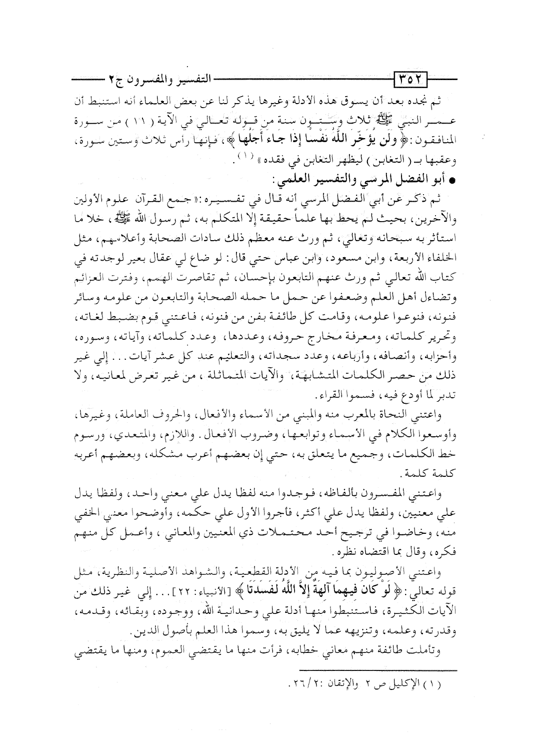 ثم ذكر عن أبى الفضل المرسى أنه قال فى تفسيره: "جمع القرآن علوم الأوَّلين والآخرين، بحيث لم يحط بها علماً حقيقة إلا المتكلم به، ثم رسول الله صلى الله عليه وسلم، خلا ما استأثر به سبحانه وتعالى، ثم ورث عنه معظم ذلك سادات الصحابة وأعلامهم، مثل الخلفاء الأربعة، وابن مسعود، وابن عباس حتى قال: لو ضاع لى عقال بعير لوجدته فى كتاب الله تعالى، ثم ورث عنهم التابعون بإحسان، ثم تقاصرت الهمم، وفترت العزائم، وتضاءل أهل العلم وضعفوا عن حمل ما حمله الصحابة والتابعون من علومه وسائر فنونه، فنوَّعوا علومه، وقامت كل طائفة بفن من فنونه، فاعتنى قوم بضبط لغاته، وتحرير كلماته، ومعرفة مخارج حروفه، وعددها، وعدد كلماته، وآياته، وسوره، وأحزابه، وأنصافه، وأرباعه، وعدد سجداته، والتعليم عند كل عشر آيات ... إلى غير ذلك من حصر الكلمات المتشابهة، والآيات المتماثلة، من غير تعرض لمعانيه، ولا تدبر لما أُودع فيه، فسُمُّوا القُرَّاء.