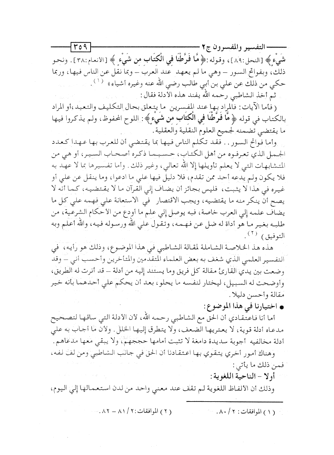 هذه هى الخلاصة الشاملة لمقالة الشاطبى فى هذا الموضوع، وذلك هو رأيه فى التفسير العلمى الذى شغف به بعض العلماء المتقدمين والمتأخرين، وأحسب أنى - وقد وضعت بين يدى القارىء مقالة كل فريق وما يستند إليه من أدلة - قد أنرتُ له الطريق، وأوضحتُ له السبيل، ليختار لنفسه ما يحلو، بعد أن يحكم على أحدهما بأنه خير مقالة وأحسن دليلاً.