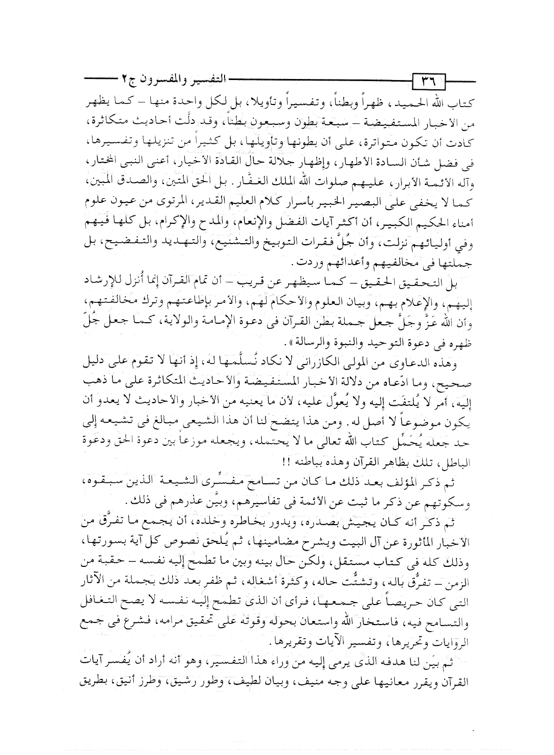 وهذه الدعاوى من المولى الكازرانى لا نكاد نُسلِّمها له، إذ أنها لا تقوم على دليل صحيح، وما ادّعاه من دلالة الأخبار المستفيضة والأحاديث المتكاثرة على ما ذهب إليه، أمر لا يُلتفَت إليه ولا يُعوَّل عليه، لأن ما يعنيه من الأخبار والأحاديث لا يعدو أن يكون موضوعاً لا أصل له. ومن هذا يتضح لنا أن هذا الشيعى مبالغ فى تشيعه إلى حد جعله يُحَمِّل كتاب الله تعالى ما لا يحتمله، ويجعله موزعاً بين دعوة الحق ودعوة الباطل، تلك بظاهرالقرآن وهذه بباطنه!!